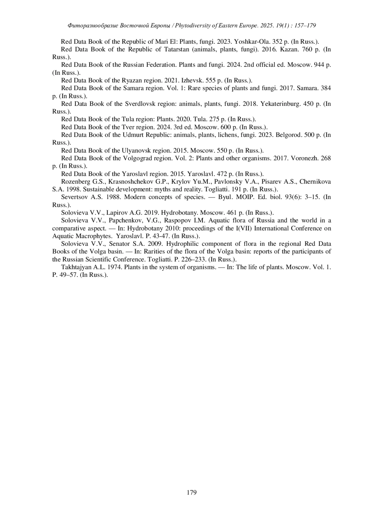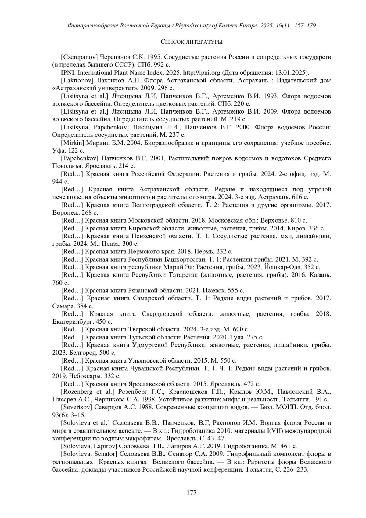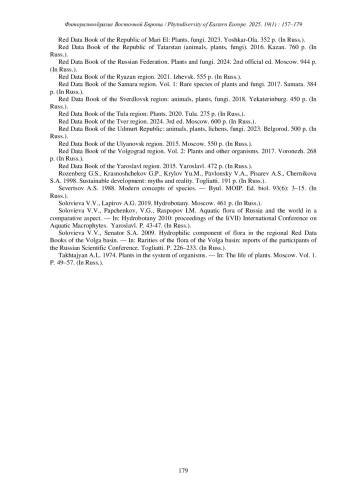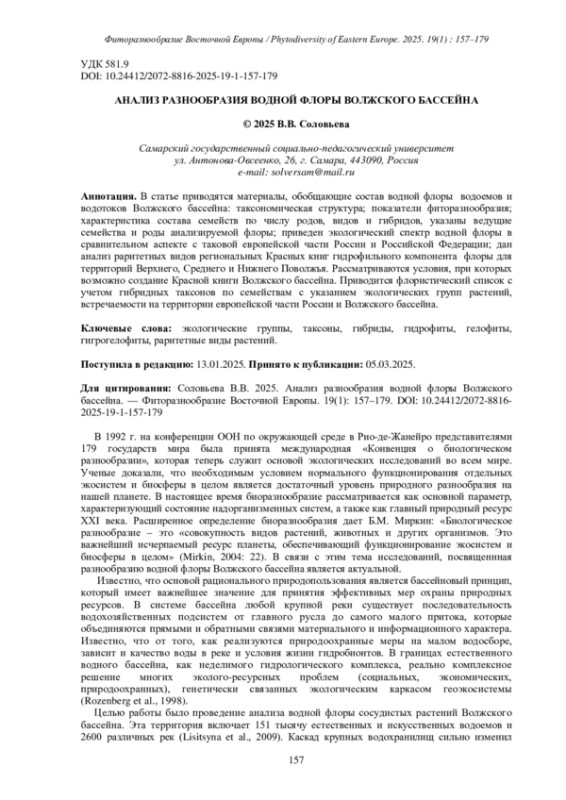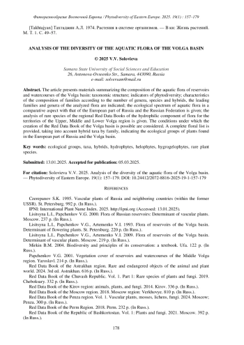 СОЛОВЬЕВА В.В. АНАЛИЗ РАЗНООБРАЗИЯ ВОДНОЙ ФЛОРЫ ВОЛЖСКОГО БАССЕЙНА // ФИТОРАЗНООБРАЗИЕ ВОСТОЧНОЙ ЕВРОПЫ. 2025. Т. 19 № 1 (17 СТ.)