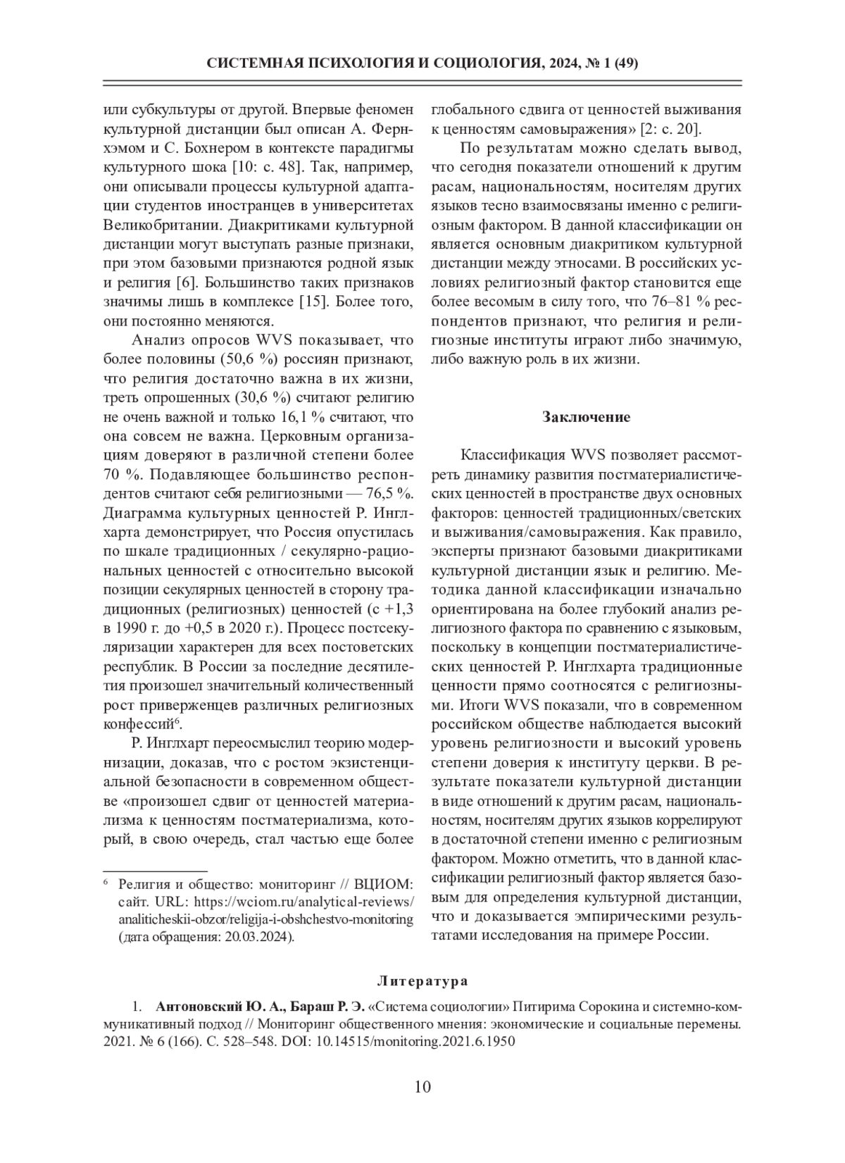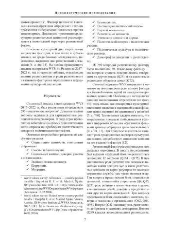 Р. Инглхарт переосмыслил теорию модернизации, доказав, что с ростом экзистенциальной безопасности в современном обществе постматериалистические ценности неизбежно трансформируются в ценности светские и ценности самовыражения. Всемирное исследование ценностей 2017-2022 гг. проводилось по 290 тематическим вопросам. В результате было выявлено, что показатели отношений к другим расам, национальностям, носителям других языков тесно взаимосвязаны с религиозным фактором. В данной классификации религиозный фактор является базовым для определения культурной дистанции, что и доказывается результатами исследования по России. В российских условиях религиозн ый фактор становится еще более весомым в силу того, что большинство респондентов признают, что религия и рели гиозные институты играют либо значимую, либо важную роль в их жизни.