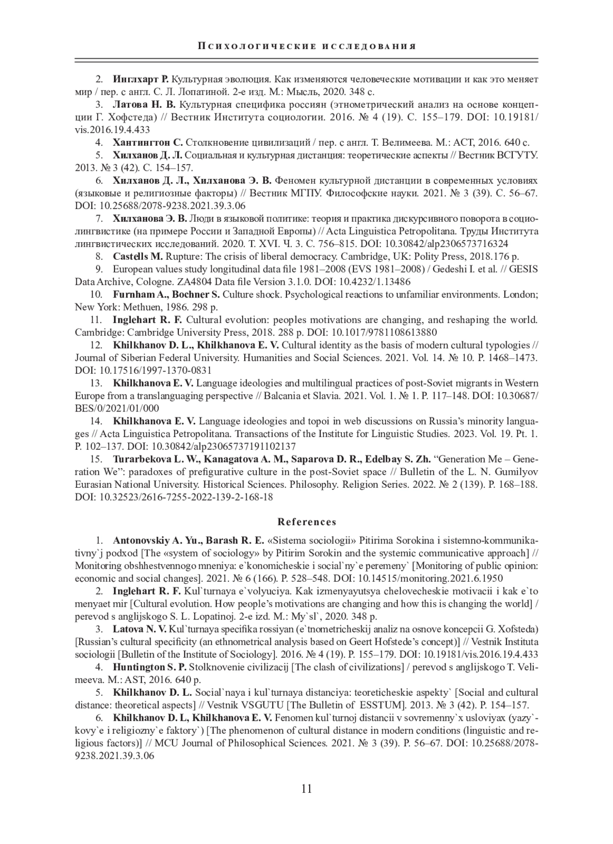 6. Хилханов Д. Л., Хилханова Э. В. Феномен культурной дистанции в современных условиях (языковые и религиозные факторы) // Вестник МГПУ. Философские науки. 2021. № 3 (39). С. 56-67. DOI: 10.25688/2078-9238.2021.39.3.06 EDN: IXASLI