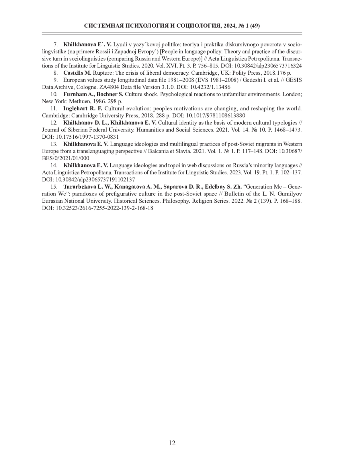 15. Turarbekova L. W., Kanagatova A. M., Saparova D. R., Edelbay S. Zh. “Generation Me - Generation We”: paradoxes of prefigurative culture in the post-Soviet space // Bulletin of the L. N. Gumilyov Eurasian National University. Historical Sciences. Philosophy. Religion Series. 2022. № 2 (139). С. 168-188. DOI: 10.32523/2616-7255-2022-139-2-168-18 EDN: JHOAOT