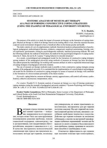 ДЯДЫК Н. Г. СИСТЕМНЫЙ АНАЛИЗ МУЗЕЙНОЙ АРТ-ТЕРАПИИ КАК СПОСОБА ФОРМИРОВАНИЯ КОНСТРУКТИВНЫХ КОПИНГ-СТРАТЕГИЙ (НА ПРИМЕРЕ СТУДЕНТОВ ПЕДАГОГИЧЕСКОГО ВУЗА) // СИСТЕМНАЯ ПСИХОЛОГИЯ И СОЦИОЛОГИЯ. 2024. № 1 (49)