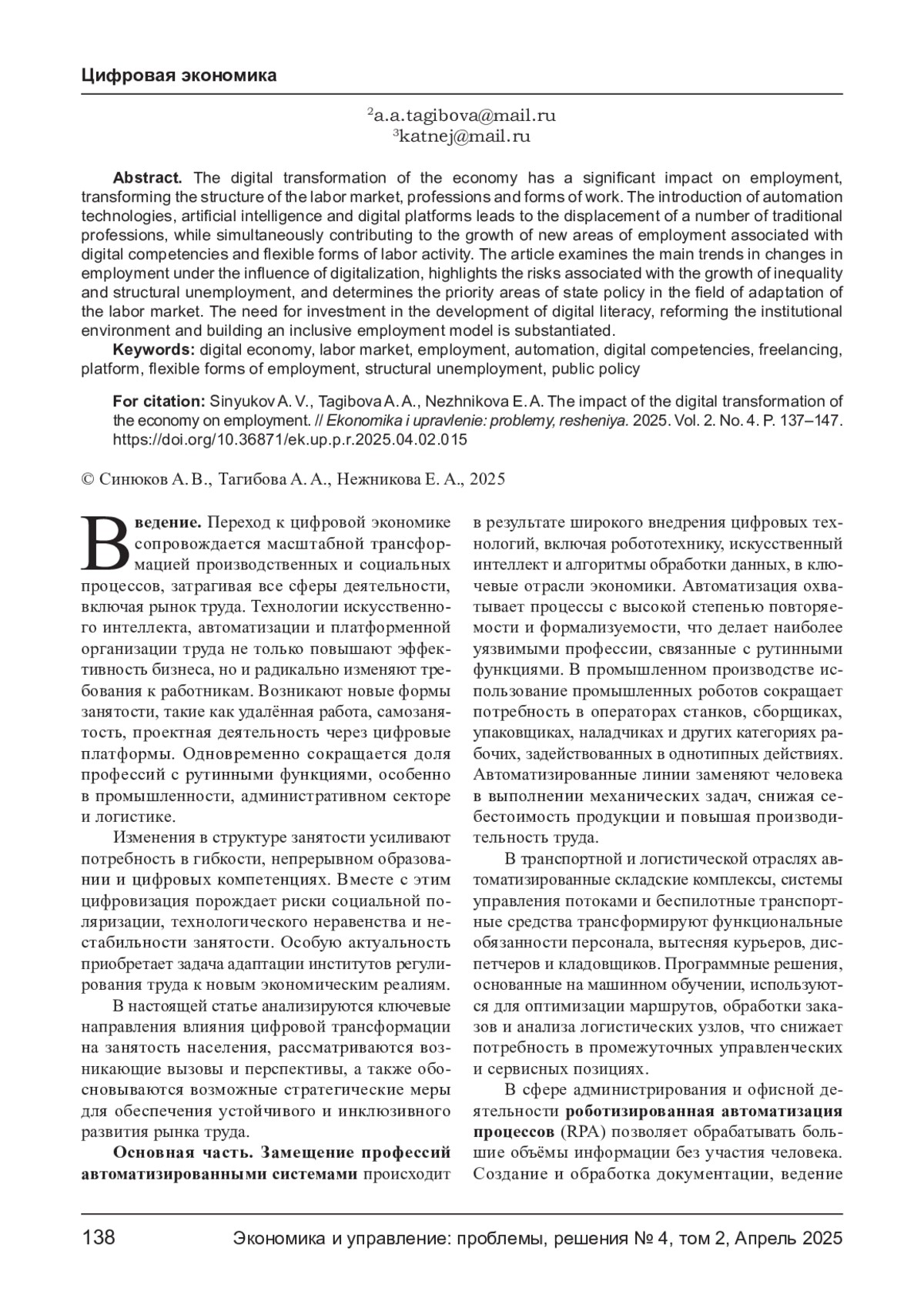 Цифровая трансформация экономики оказывает многоплановое влияние на занятость, изменяя структуру рынка труда, формы трудовых отношений и квалификационные требования к работникам. Активное внедрение технологий автоматизации, искусственного интеллекта и цифровых платформ приводит к вытеснению рутинных профессий и одновременно стимулирует рост новых сфер занятости, связанных с ИТ, анализом данных и цифровыми сервисами. В статье анализируются ключевые тенденции, связанные с трансформацией занятости в условиях цифровизации, включая риски роста неравенства, проблемы адаптации работников и необходимость модернизации государственной политики в сфере трудовых отношений. Обосновано, что долгосрочная устойчивость занятости в цифровой экономике требует системных инвестиций в развитие цифровых компетенций и институциональных реформ, обеспечивающих гибкость и инклюзивность рынка труда.