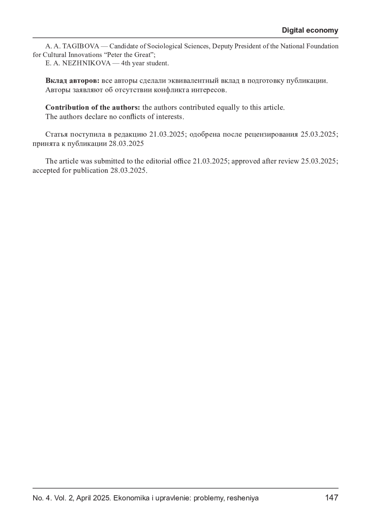 5. Мухаметшина, Ф. А. Развитие компетенций ИТ-специалистов в условиях перехода к цифровой экономике / Ф. А. Мухаметшина, И. М. Сафаров // Экономика и управление: проблемы, решения. - 2024. - Т. 1, № 4(145). - С. 214-219. DOI: 10.36871/ek.up.p.r.2024.04.01.028 EDN: GFLRFM