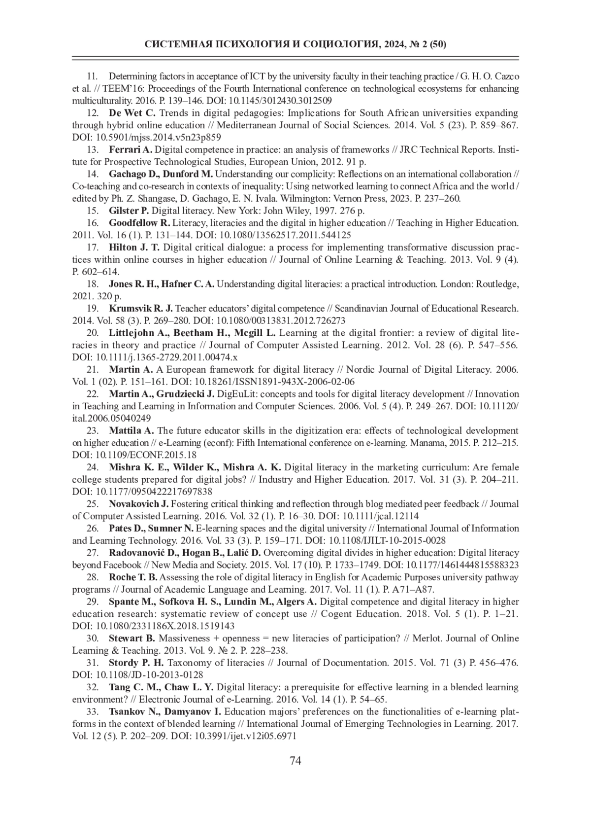 32. Tang C. M., Chaw L. Y. Digital literacy: a prerequisite for effective learning in a blended learning environment? // Electronic Journal of e-Learning. 2016. Vol. 14 (1). P. 54-65.