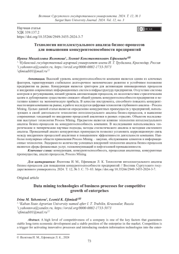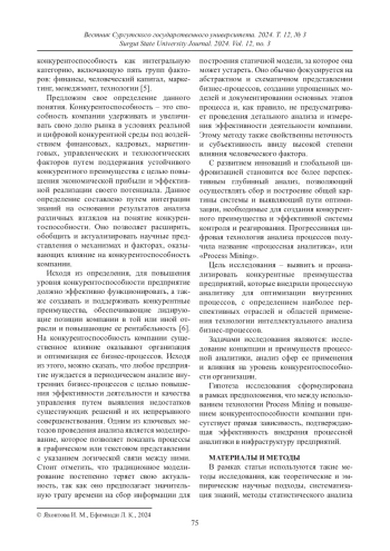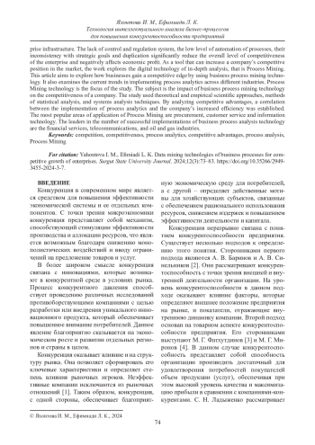 Высокий уровень конкурентоспособности компании является одним из ключевых факторов, гарантирующих стабильное долгосрочное экономическое развитие и устойчивое положение предприятия на рынке. Конкуренция является триггером для активизации инновационных процессов и внедрения современных информационных систем в инфраструктуру предприятия. Отсутствие системы контроля и регулирования, низкий уровень автоматизации процессов, их несоответствие стратегическим целям и дублирование существенно снижают общий уровень конкурентоспособности предприятия и негативно влияют на экономическую прибыль. В качестве инструмента, способного повысить конкурентные позиции компании на рынке, в работе исследуется цифровая технология глубинного анализа – Process Mining. Целью данной статьи является определение конкурентных преимуществ у предприятий, использующих в своей деятельности технологию интеллектуального анализа бизнес-процессов, и выявление современных тенденций по внедрению процессной аналитики в разных отраслях. Объектом исследования выступает технология Process Mining. Предметом является влияние технологии интеллектуального анализа бизнес-процессов на конкурентоспособность компании. В исследовании использовались теоретические и эмпирические научные подходы, методы статистического анализа и методики системного анализа. Проведенный анализ конкурентных преимуществ позволил установить корреляционную связь между внедрением процессной аналитики и повышением эффективности деятельности компании. Наиболее популярные области применения Process Mining – закупки, обслуживание клиентов и информационные технологии. Лидерами по количеству успешных внедрений технологии анализа бизнес-процессов являются сферы финансовых услуг, телекоммуникаций и нефтегазовой промышленности.