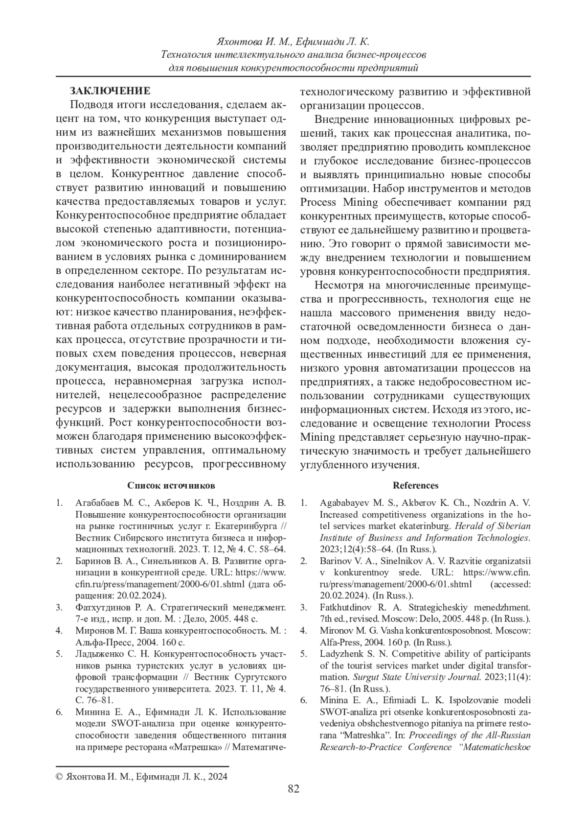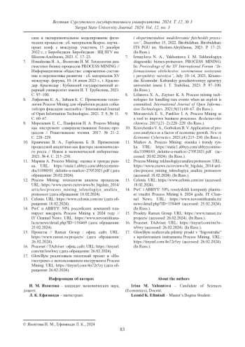 7. Измайлова Н. А., Яхонтова И. М. Технология диагностики бизнес-процессов PROCESS MINING // Информационное общество: современное состояние и перспективы развития : сб. материалов XV междунар. форума, 10-14 июля 2023 г., г. Краснодар. Краснодар : Кубанский государственный аграрный университет имени И. Т. Трубилина, 2023. С. 97-100.
