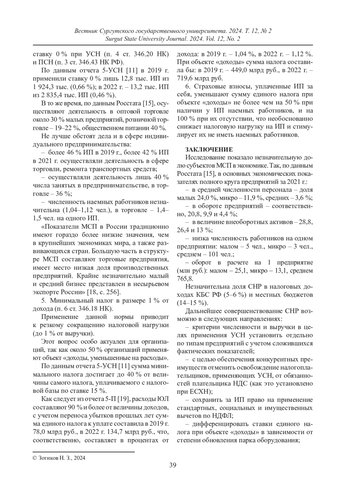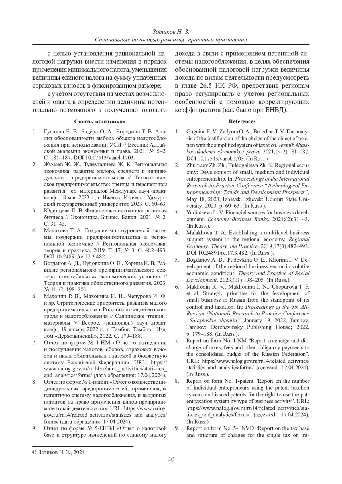 1. Гугнина Е. В., Задёра О. А., Бородина Т. В. Анализ обоснованности выбора объекта налогообложения при использовании УСН // Вестник Алтайской академии экономики и права. 2021. № 5-2. С. 181-187. https://doi.org/10.17513/vaael.1703.