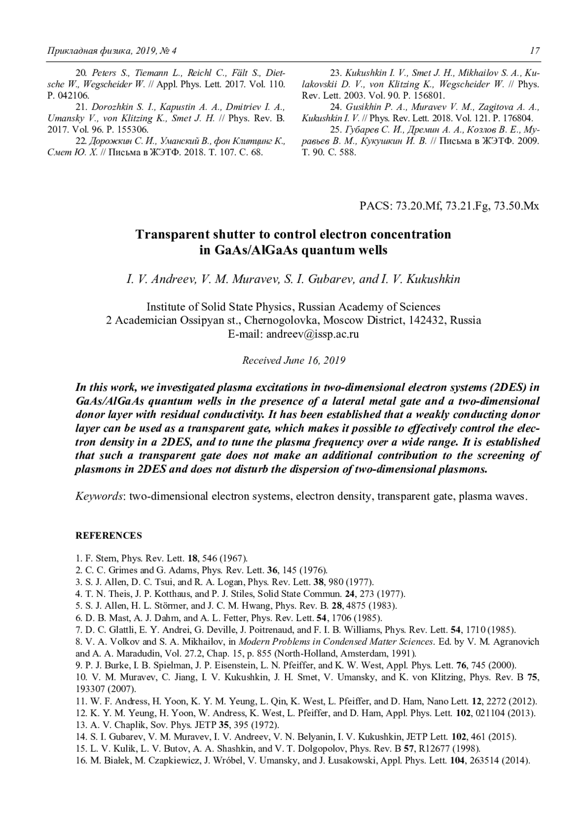 Андреев И. В., Муравьев В. М., Губарев С. И., Кукушкин И. В. Прозрачный затвор для управления концентрацией электронов в квантовых ямах GaAs/AlGaAs 11