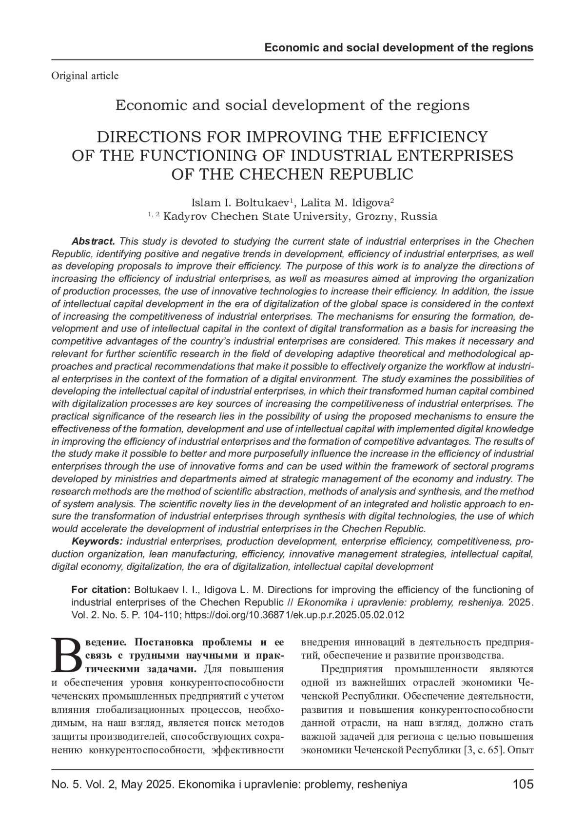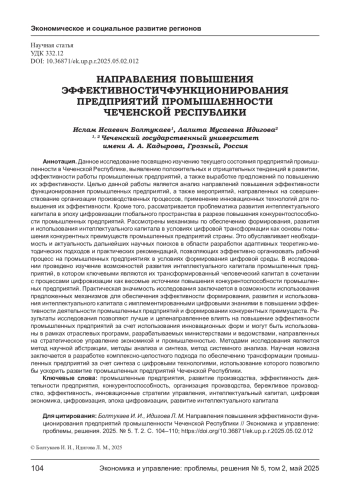 Целью данной работы является анализ направлений повышения эффективности функционирования промышленных предприятий, а также мероприятий, направленных на совершенствование организации производственных процессов, применение инновационных технологий для повышения их эффективности. Кроме того, рассматривается проблематика развития интеллектуального капитала в эпоху цифровизации глобального пространства в разрезе повышения конкурентоспособности промышленных предприятий. Рассмотрены механизмы по обеспечению формирования, развития и использования интеллектуального капитала в условиях цифровой трансформации как основы повышения конкурентных преимуществ промышленных предприятий страны. Это обуславливает необходимость и актуальность дальнейших научных поисков в области разработки адаптивных теоретико-методических подходов и практических рекомендаций, позволяющих эффективно организовать рабочий процесс на промышленных предприятиях в условиях формирования цифровой среды. В исследовании проведено изучение возможностей развития интеллектуального капитала промышленных предприятий, в котором ключевыми являются их трансформированный человеческий капитал в сочетании с процессами цифровизации как весомые источники повышения конкурентоспособности промышленных предприятий. Практическая значимость исследования заключается в возможности использования предложенных механизмов для обеспечения эффективности формирования, развития и использования интеллектуального капитала с имплементированными цифровыми знаниями в повышении эффективности деятельности промышленных предприятий и формировании конкурентных преимуществ. Результаты исследования позволяют лучше и целенаправленнее влиять на повышение эффективности промышленных предприятий за счет использования инновационных форм и могут быть использованы в рамках отраслевых программ, разрабатываемых министерствами и ведомствами, направленных на стратегическое управление экономикой и промышленностью. Методами исследования являются метод научной абстракции, методы анализа и синтеза, метод системного анализа. Научная новизна заключается в разработке комплексно-целостного подхода по обеспечению трансформации промышленных предприятий за счет синтеза с цифровыми технологиями, использование которого позволило бы ускорить развитие промышленных предприятий Чеченской Республики.
