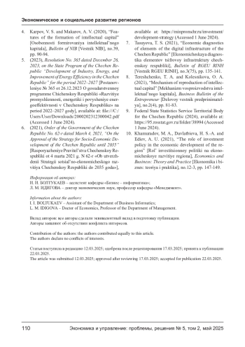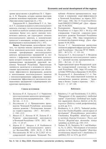 2. Бисултанова А. А. Промышленное производство Чеченской Республики: актуальные аспекты развития // Региональная экономика: теория и практика. - 2017. - № 8 (443). - С. 1501-1515. EDN: ZCQGWN