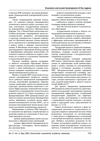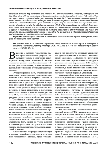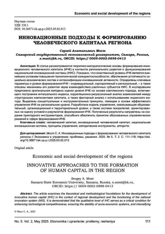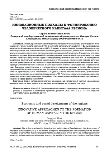 В статье рассматриваются теоретико-методологические основы формирования инновационного человеческого капитала (ИЧК) в контексте регионального развития и функционирования национальной инновационной системы (НИС). Показано, что качественный уровень ИЧК является важнейшим условием повышения технологической конкурентоспособности, обеспечения устойчивости социально-экономических систем и интенсификации инновационной активности. Определены ключевые параметры и уровни формирования ИЧК - индивидуальный, корпоративный и региональный, - а также описаны механизмы его развития через взаимодействие различных субъектов НИС. В исследовании предложена оригинальная методика оценки уровня ИЧК на основе комплексного подхода, включающего построение интегрального индекса, корреляционно-регрессионный анализ взаимосвязей между структурными компонентами капитала, а также факторный анализ с использованием индексного метода. Выделены концептуальные и инструментальные принципы, лежащие в основе эффективного управления ИЧК на региональном уровне. Разработана модель управления, охватывающая образовательный, организационный и территориальный уровни, а также система показателей, ориентированных на оценку условий и результатов формирования ИЧК. Полученные результаты направлены на создание прикладного инструментария, способного обеспечить принятие обоснованных управленческих решений в сфере формирования ИЧК.