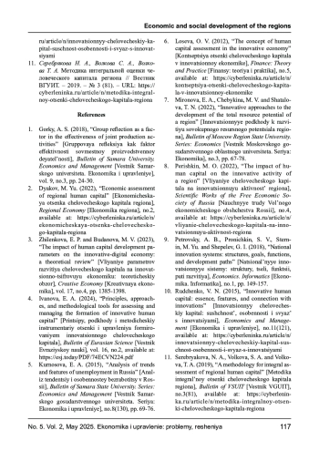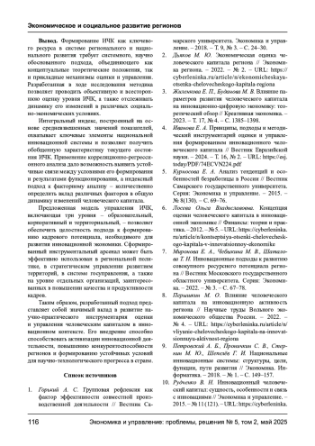 8. Перышкин М. О. Влияние человеческого капитала на инновационную активность региона // Научные труды Вольного экономического общества России. - 2022. - № 4. - URL: https://cyberleninka.ru/article/n/vliyanie-chelovecheskogo-kapitala-na-innovatsionnuyu-aktivnost-regiona. EDN: IZAMJE