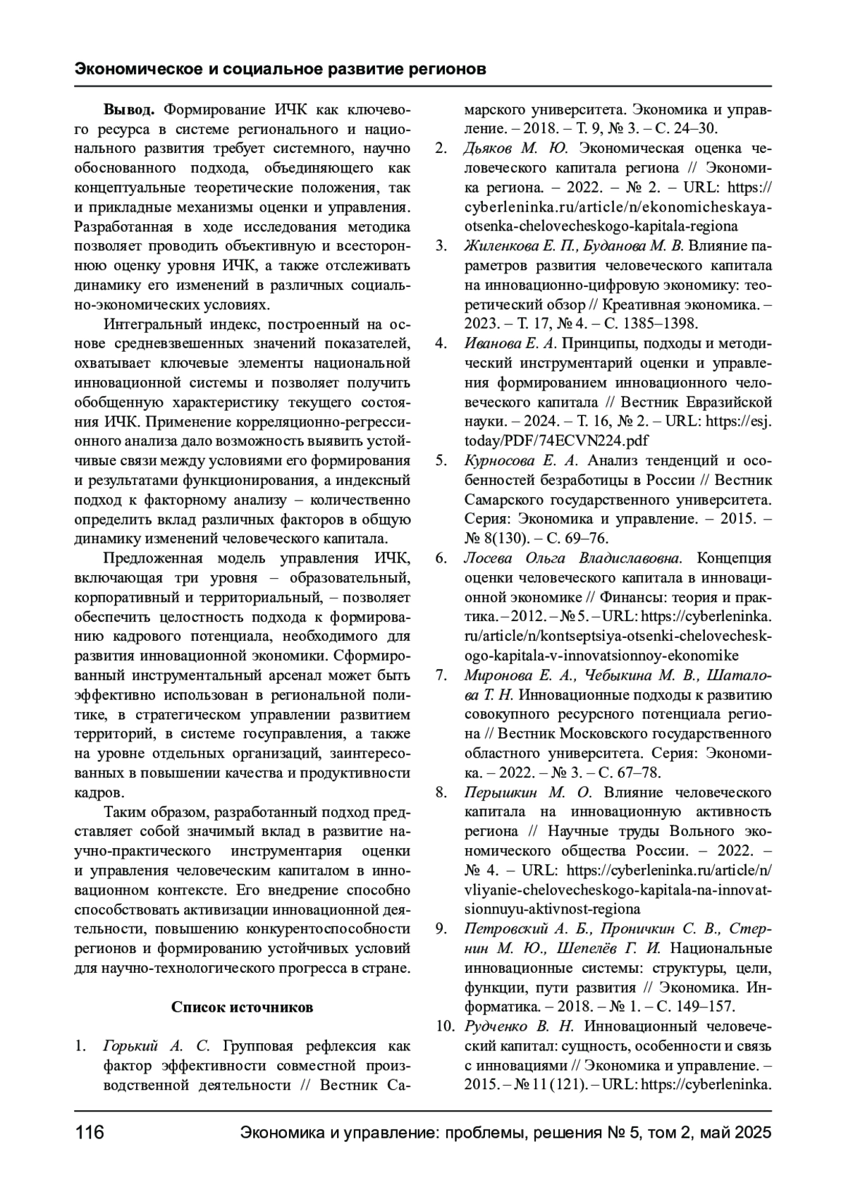 10. Рудченко В. Н. Инновационный человеческий капитал: сущность, особенности и связь с инновациями // Экономика и управление. - 2015. - № 11 (121). - URL: https://cyberleninka.ru/article/n/innovatsionnyy-chelovecheskiy-kapital-suschnost-osobennosti-i-svyaz-s-innovatsiyami. EDN: VCKUHJ