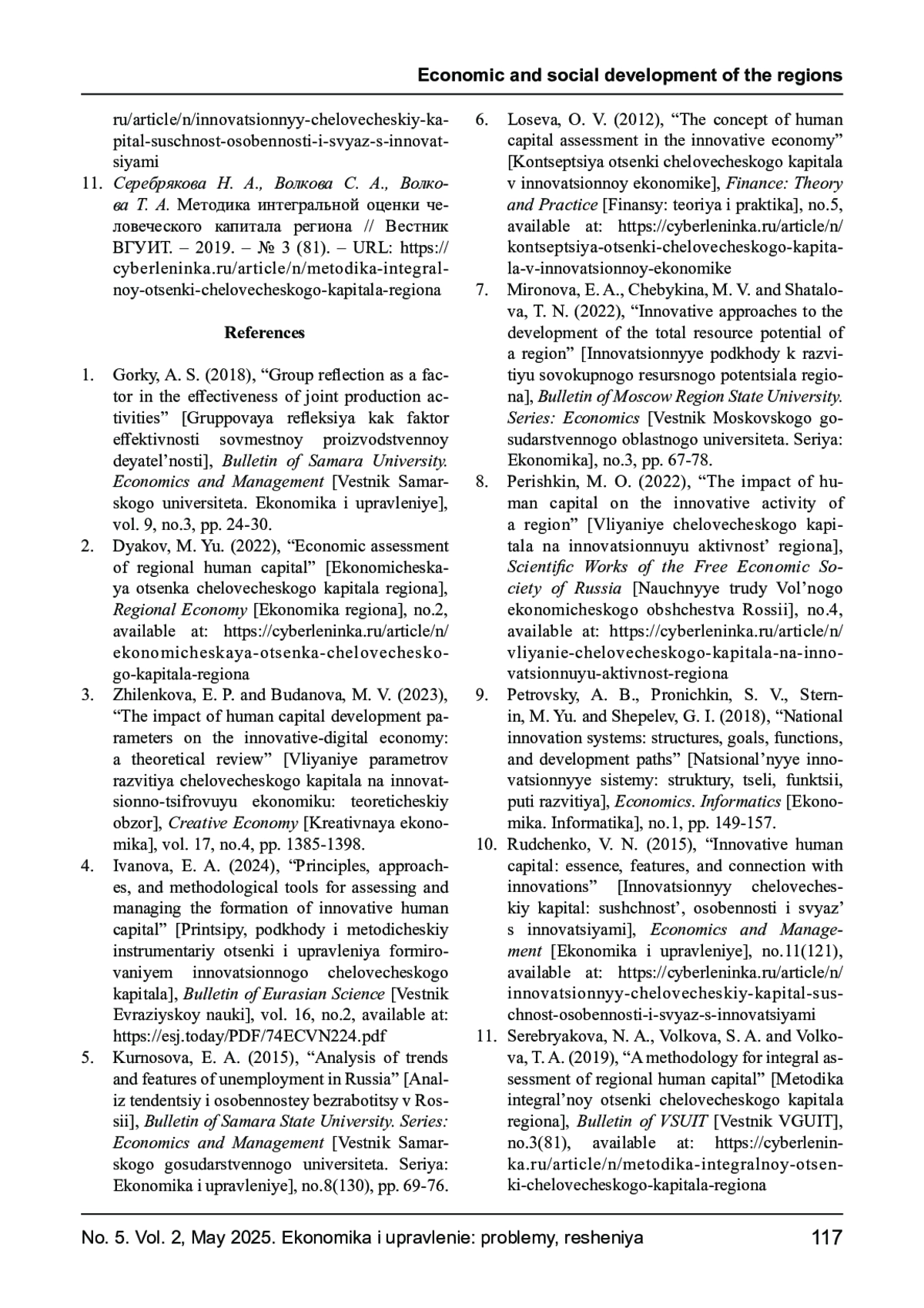 11. Серебрякова Н. А., Волкова С. А., Волкова Т. А. Методика интегральной оценки человеческого капитала региона // Вестник ВГУИТ. - 2019. - № 3 (81). - URL: https://cyberleninka.ru/article/n/metodika-integralnoy-otsenki-chelovecheskogo-kapitala-regiona.