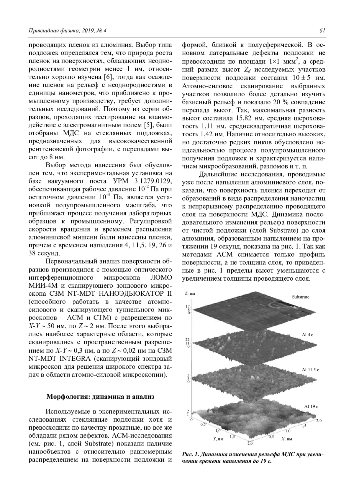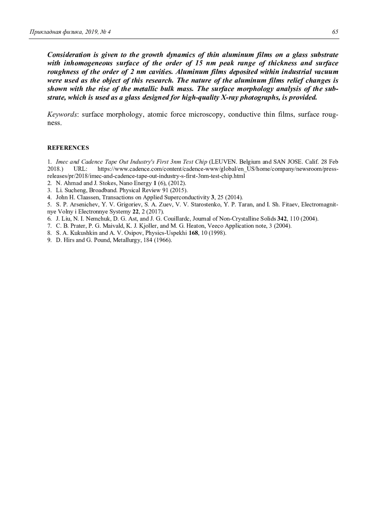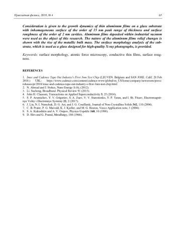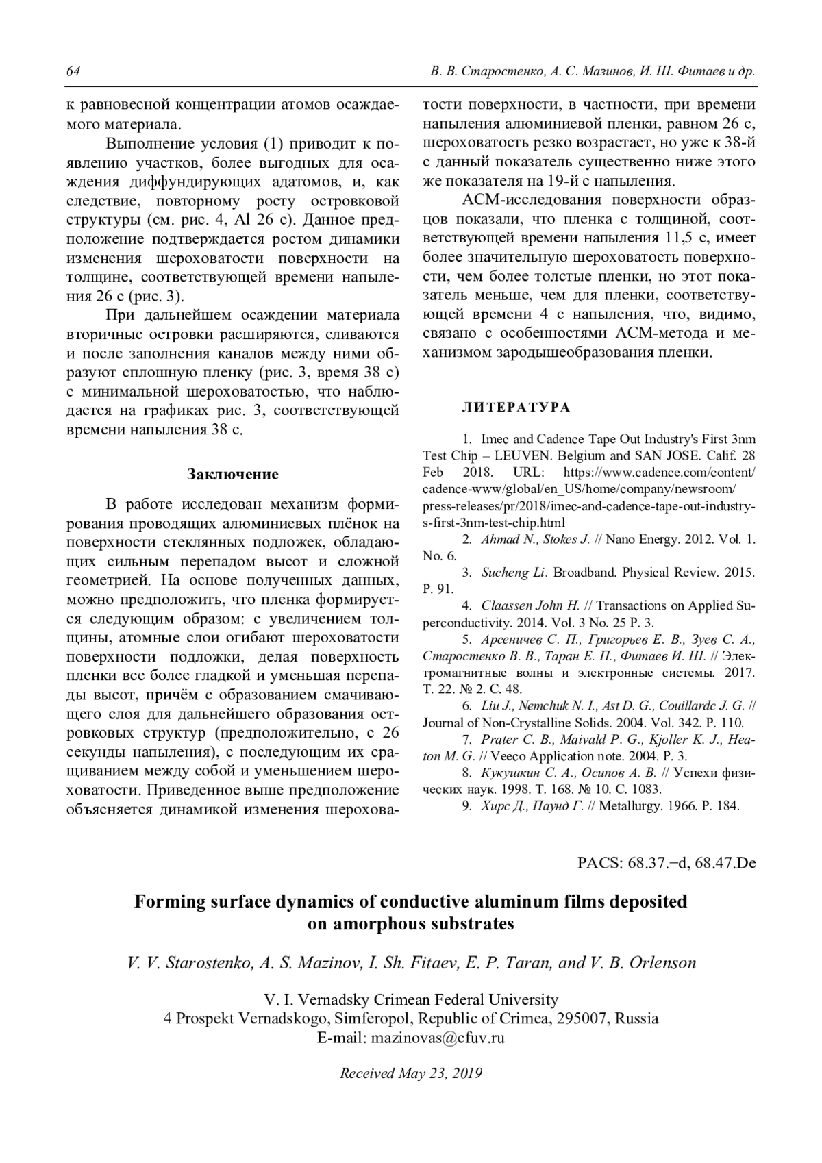 СТАРОСТЕНКО В. В., МАЗИНОВ А. С., ФИТАЕВ И. Ш., ТАРАН Е. В., ОРЛЕНСОН В. Б. ДИНАМИКА ФОРМИРОВАНИЯ ПОВЕРХНОСТИ ПРОВОДЯЩИХ ПЛЕНОК АЛЮМИНИЯ НА АМОРФНЫХ ПОДЛОЖКАХ // ПРИКЛАДНАЯ ФИЗИКА. 2019. №4