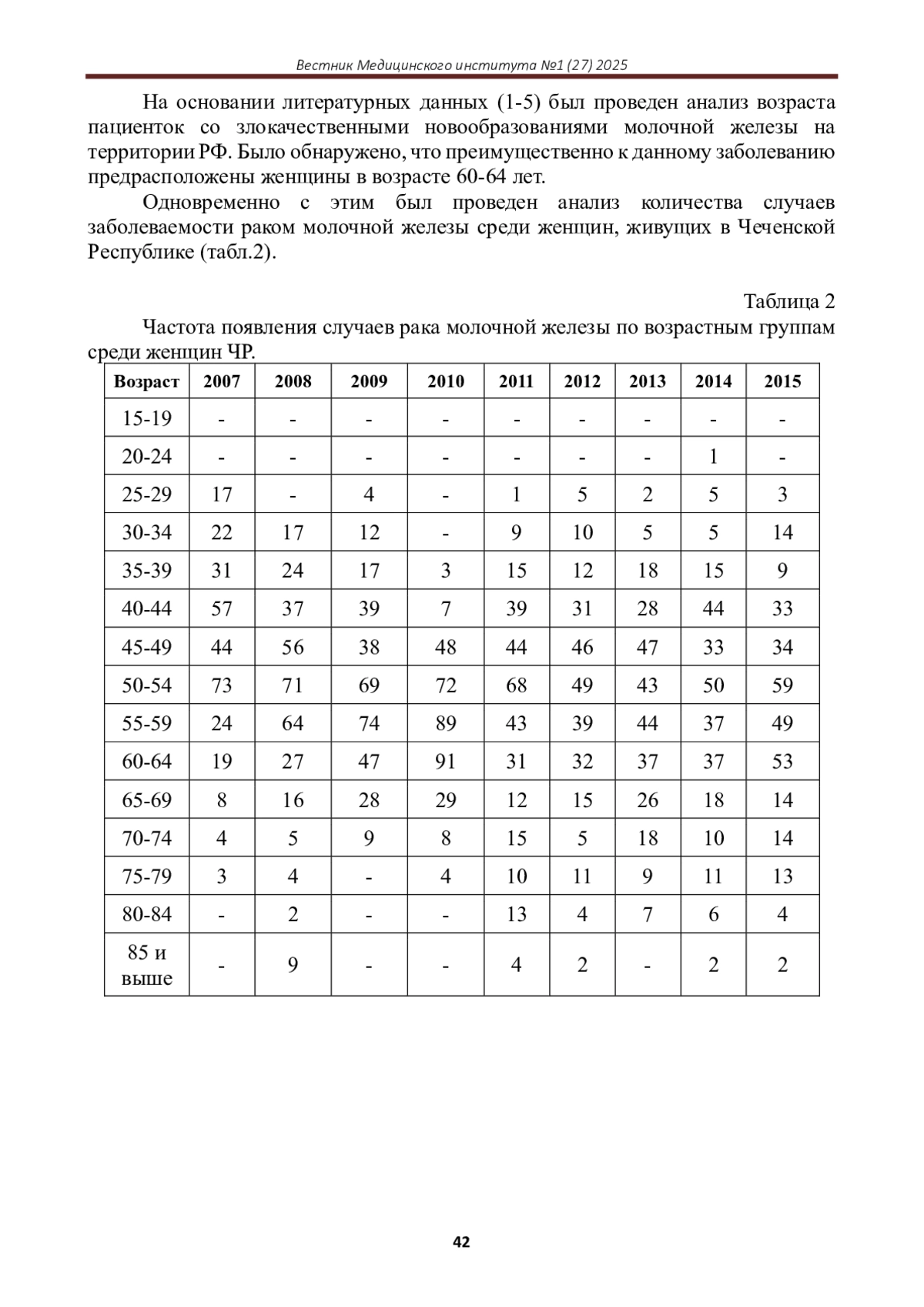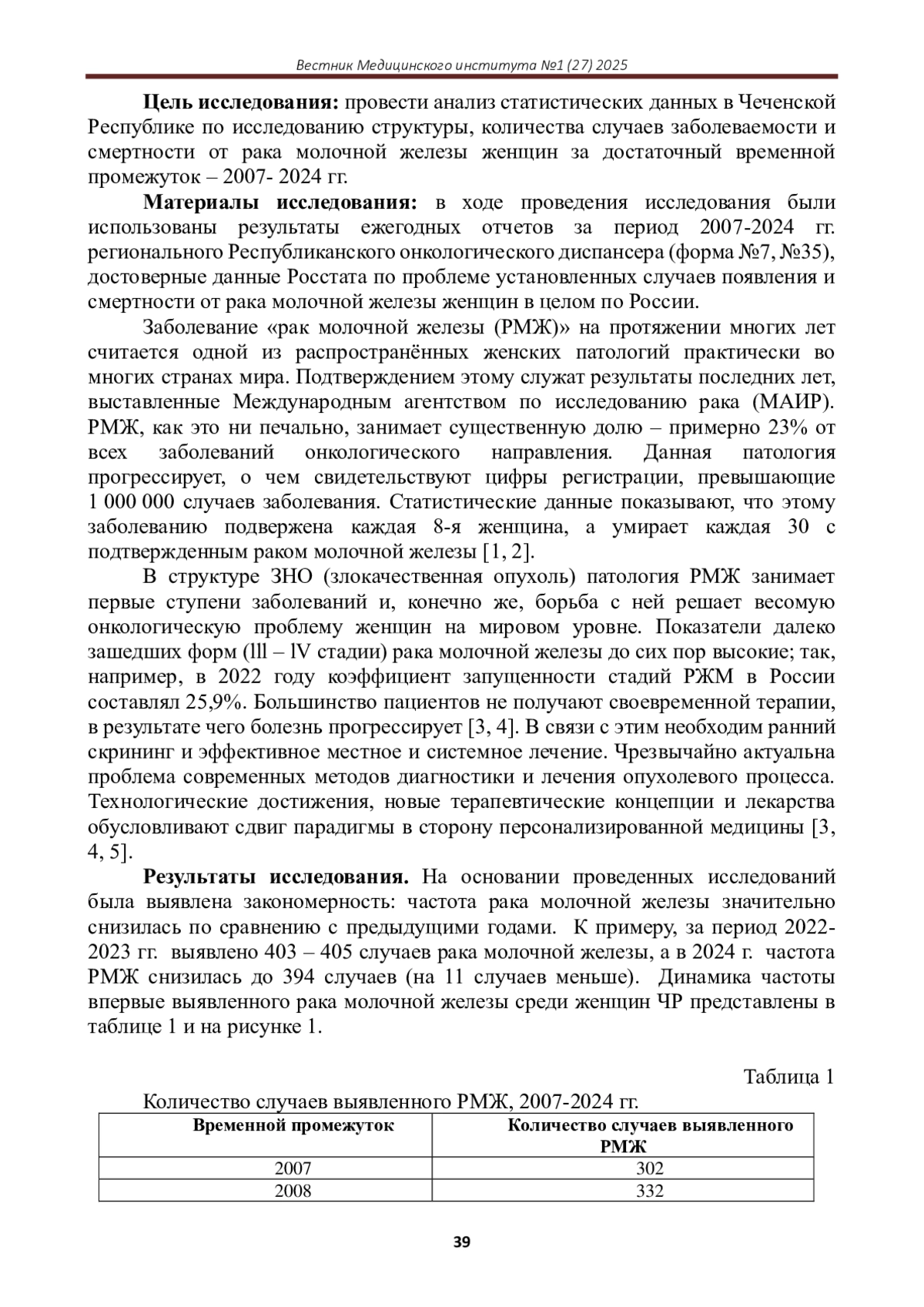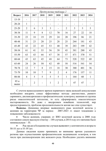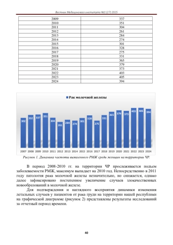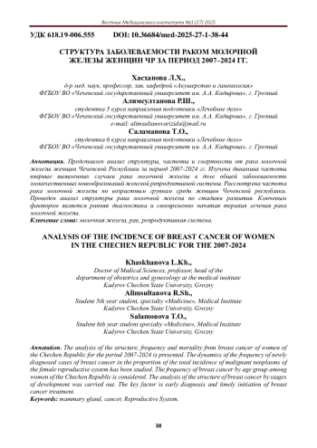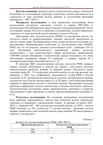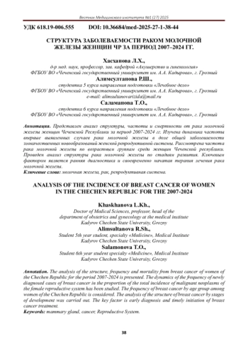 Статья: СТРУКТУРА ЗАБОЛЕВАЕМОСТИ РАКОМ МОЛОЧНОЙ ЖЕЛЕЗЫ ЖЕНЩИН ЧР ЗА ПЕРИОД 2007-2024 ГГ (2025)