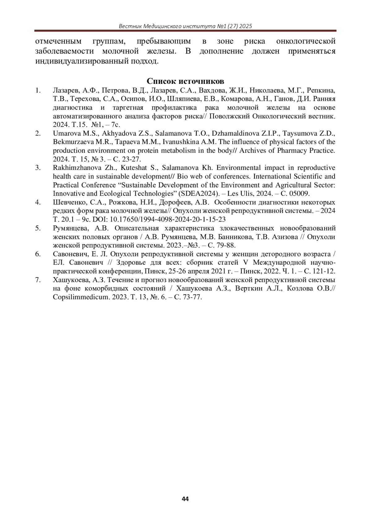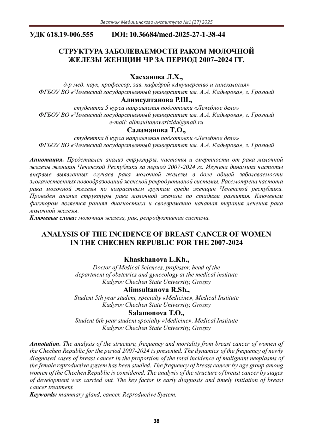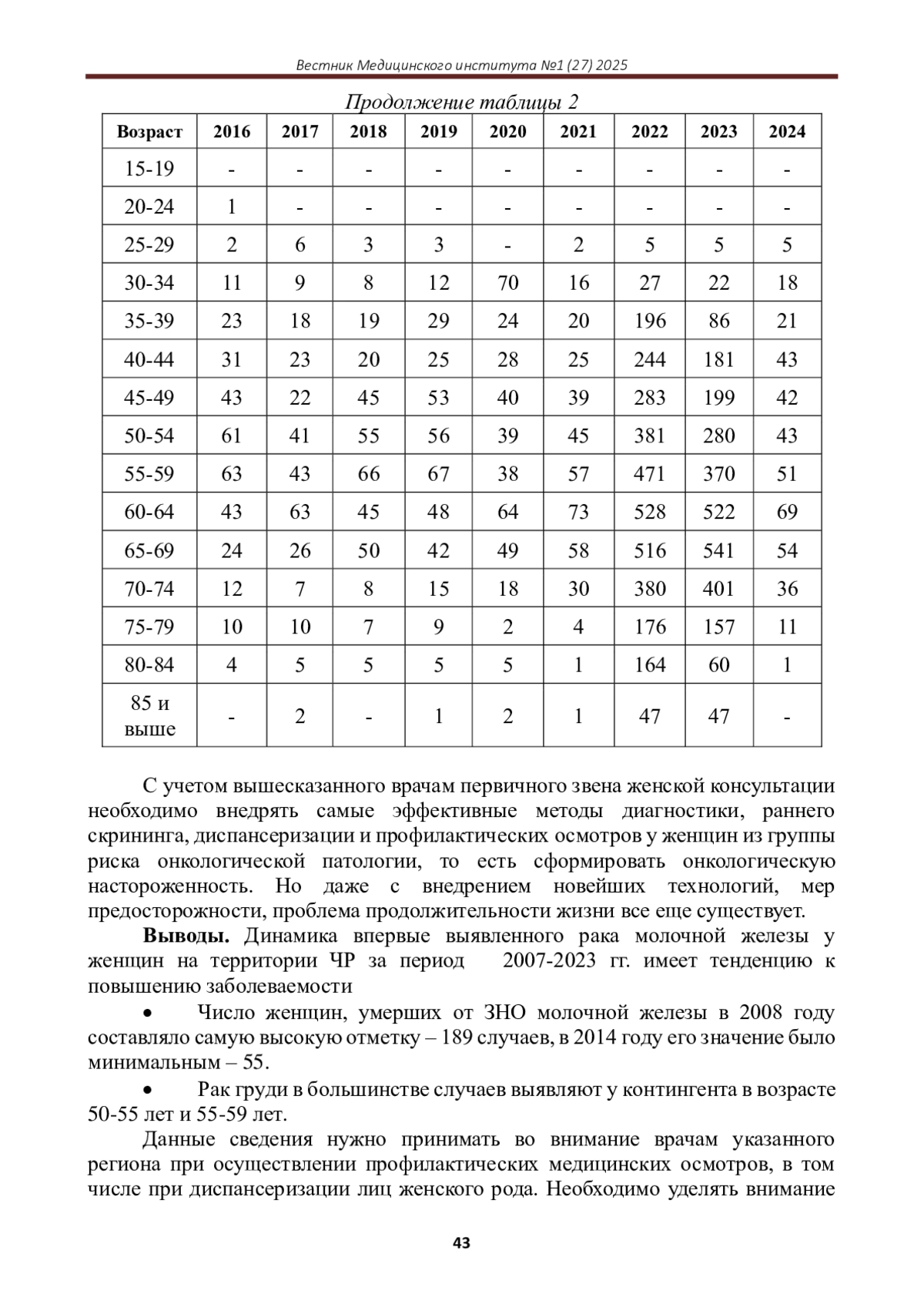 Статья: СТРУКТУРА ЗАБОЛЕВАЕМОСТИ РАКОМ МОЛОЧНОЙ ЖЕЛЕЗЫ ЖЕНЩИН ЧР ЗА ПЕРИОД 2007-2024 ГГ (2025)