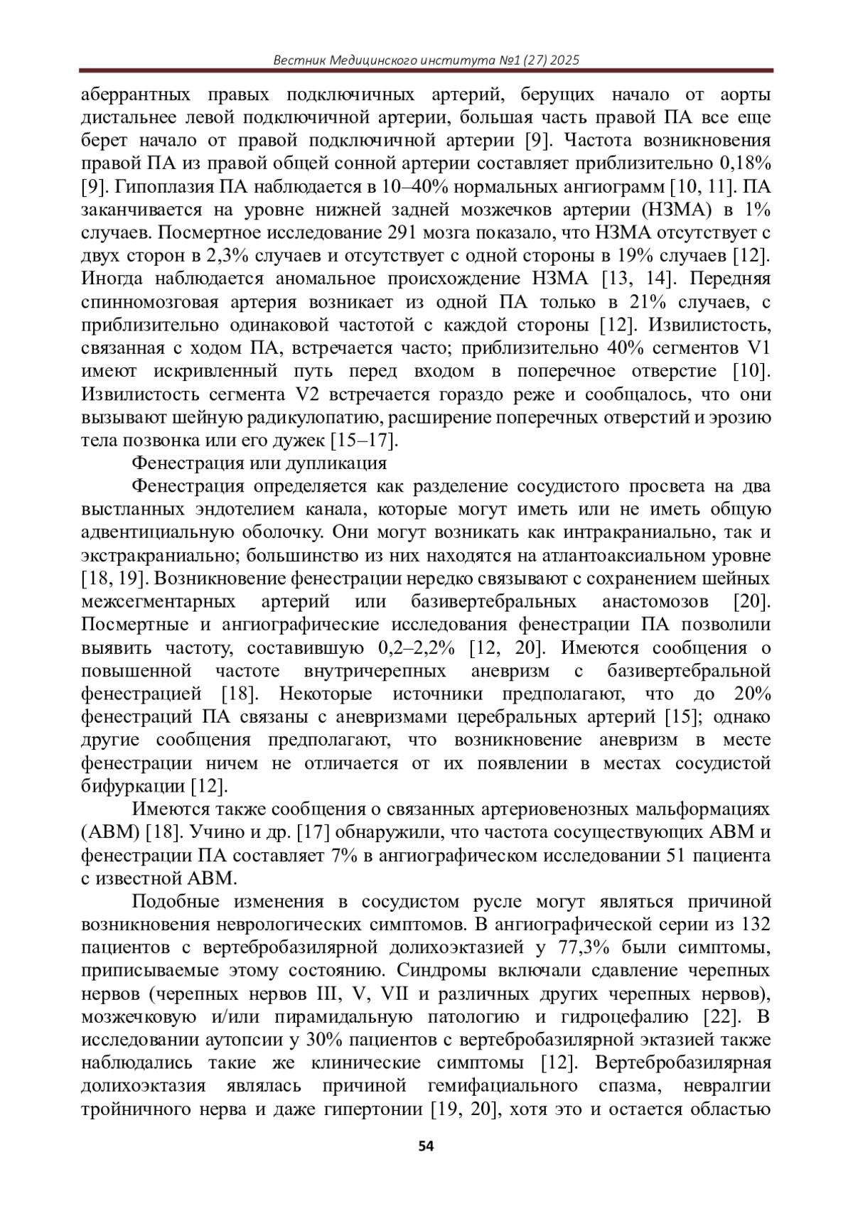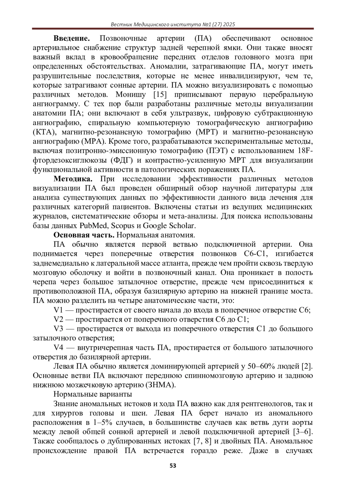 ДОКАЕВА Т.С., МЕЖИДОВ С.-М.Н., КАФАРОВ А.Э. ВИЗУАЛИЗАЦИЯ ПОЗВОНОЧНОЙ АРТЕРИИ // ВЕСТНИК МЕДИЦИНСКОГО ИНСТИТУТА. 2025. № 1 (27)
