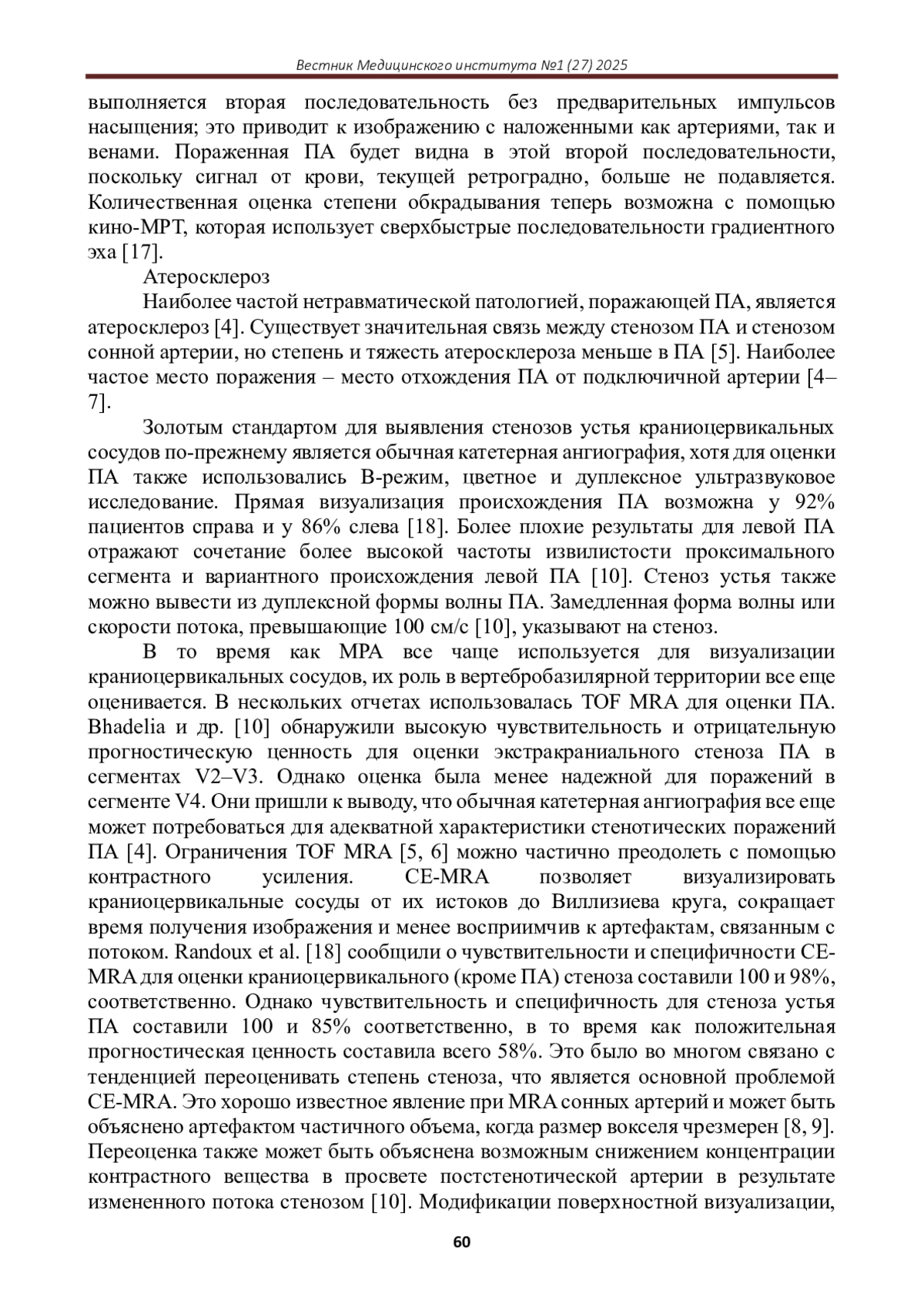 Ключевые фразы: позвоночная артерия, визуализация, диагностика, мр-ангиография, допплерография