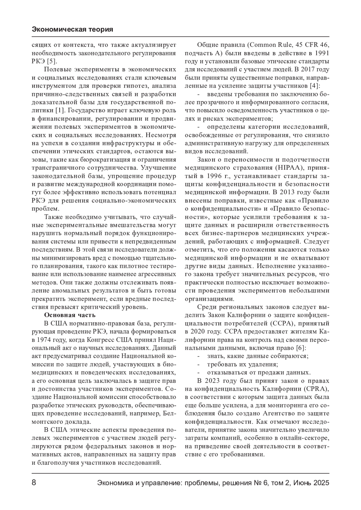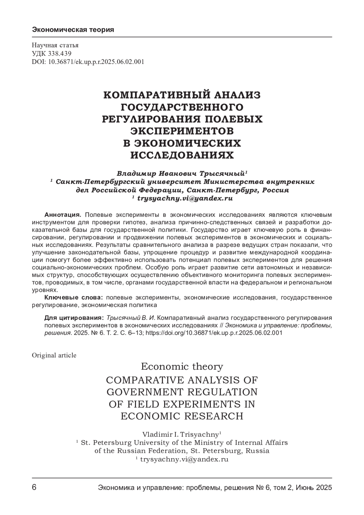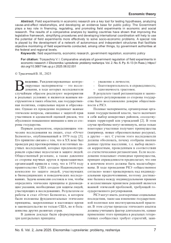 Полевые эксперименты в экономических исследованиях являются ключевым инструментом для проверки гипотез, анализа причинно- следственных связей и разработки доказательной базы для государственной политики. Государство играет ключевую роль в финансировании, регулировании и продвижении полевых экспериментов в экономических и социальных исследованиях. Результаты сравнительного анализа в разрезе ведущих стран показали, что улучшение законодательной базы, упрощение процедур и развитие международной координации помогут более эффективно использовать потенциал полевых экспериментов для решения социально- экономических проблем. Особую роль играет развитие сети автономных и независимых структур, способствующих осуществлению объективного мониторинга полевых экспериментов, проводимых, в том числе, органами государственной власти на федеральном и региональном уровнях.