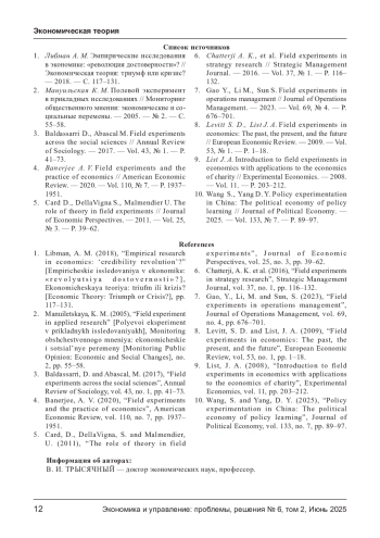 1. Либман А. М. Эмпирические исследования в экономике: “революция достоверности”? //Экономическая теория: триумф или кризис?- 2018. - С. 117-131. EDN: YYOPAT