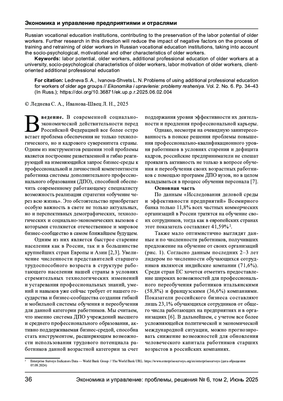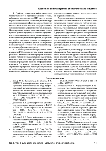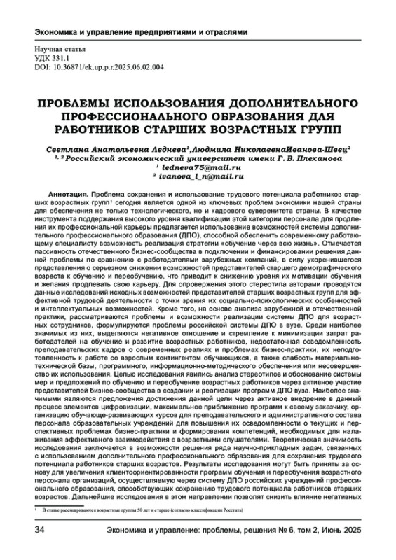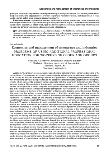 Проблема сохранения и использование трудового потенциала работников старших возрастных групп сегодня является одной из ключевых проблем экономики нашей страны для обеспечения не только технологического, но и кадрового суверенитета страны. В качестве инструмента поддержания высокого уровня квалификации этой категории персонала для продления их профессиональной карьеры предлагается использование возможностей системы дополнительного профессионального образования (ДПО), способной обеспечить современному работающему специалисту возможность реализация стратегии «обучение через всю жизнь». Отмечается пассивность отечественного бизнес - сообщества в подключении и финансировании решения данной проблемы по сравнению с работодателями зарубежных компаний, в силу укоренившегося представления о серьезном снижении возможностей представителей старшего демографического возраста к обучению и переобучению, что приводит к снижению уровня их мотивации обучения и желания продлевать свою карьеру. Для опровержения этого стереотипа авторами проводятся данные исследований исходных возможностей представителей старших возрастных групп для эффективной трудовой деятельности с точки зрения их социально - психологических особенностей и интеллектуальных возможностей. Кроме того, на основе анализа зарубежной и отечественной практики, рассматриваются проблемы и возможности реализации системы ДПО для возрастных сотрудников, формулируются проблемы российской системы ДПО в вузе. Среди наиболее значимых из них, выделяются негативное отношение и стремление к минимизации затрат работодателей на обучение и развитие возрастных работников, недостаточная осведомленность преподавательских кадров о современных реалиях и проблемах бизнес- практики, их неподготовленность к работе со взрослым контингентом обучающихся, а также слабость материально- технической базы, программного, информационно - методического обеспечения или несовершенство их использования.