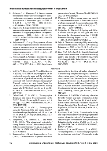 4. Касьянова Т. И., Воронина Л. И., Резер Т. М. Образовательный потенциал российских граждан пожилого возраста // Образование и наука. - 2020. - Т. 22, № 2. - С. 121-141. -. DOI: 10.17853/1994-5639-2020-2-120-142 EDN: XNTQJN