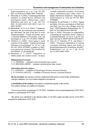 10. Хайруллина Ю. Р. и др. Непрерывное образование людей предпенсионного и пенсионного возраста: задача государства или социального предпринимательства? // Вестник экономики, права и социологии. - 2019. - № 3. - С. 170-174. EDN: VXHPLU