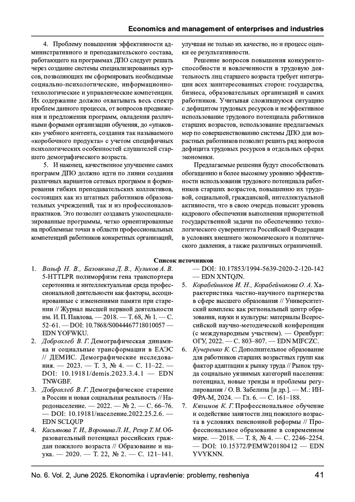7. Кязимов К. Г. Профессиональное обучение и содействие занятости лиц пожилого возраста в условиях пенсионной реформы // Профессиональное образование в современном мире. - 2018. - Т. 8, № 4. - С. 2246-2254. -. DOI: 10.15372/PEMW20180412 EDN: YVYKNN