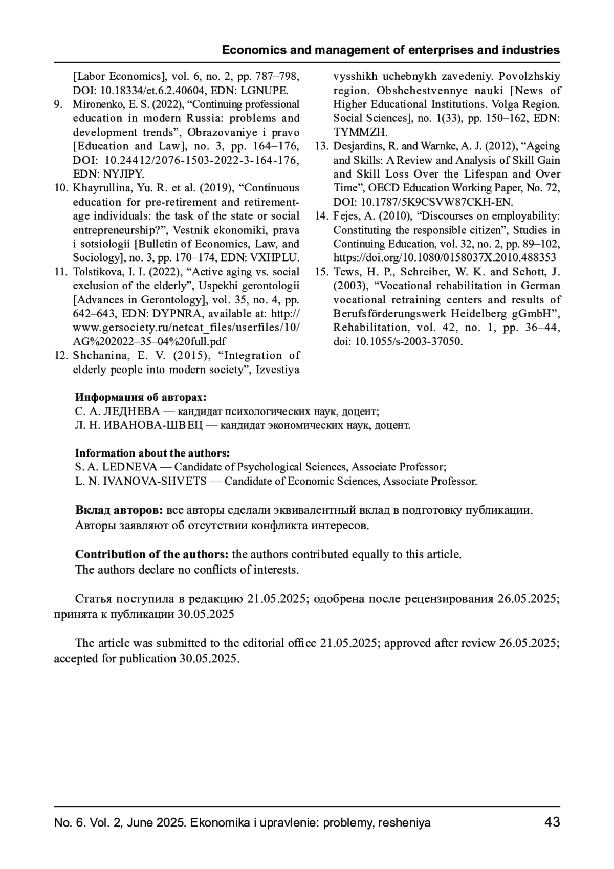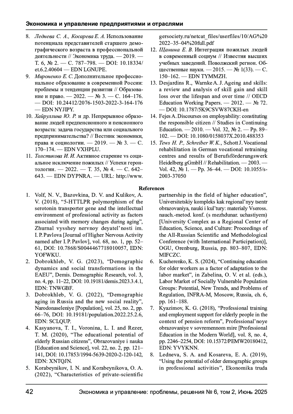 8. Леднева С. А., Косарева Е. А. Использование потенциала представителей старшего демографического возраста в профессиональной деятельности // Экономика труда. - 2019. - Т. 6, № 2. - С. 787-798. - 10.18334/ et.6.2.40604. DOI: 10.18334/et.6.2.40604 EDN: LGNUPE
