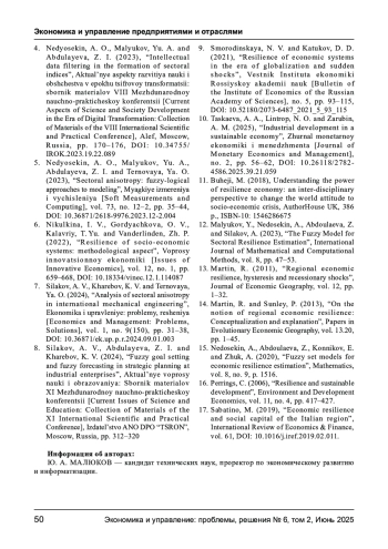 12. Malyukov Y., Nedosekin A., Abdoulaeva Z., Silakov A. The fuzzy model for sectoral resilience estimation // International Journal of Mathematical and Computational Methods. - 2023. - Vol. 8. - P. 47-53. EDN: AZHSSN