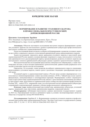 Объектом настоящего исследования выступают вопросы формирования и развития уголовного жаргона как неотъемлемого элемента криминальной субкультуры профессионального преступного сообщества в дореволюционной России. Целью исследования является анализ особенностей формирования и развития уголовного жаргона как особого социального диалекта отечественной криминальной среды дореволюционного периода. Задачи исследования: определить время зарождения уголовного жаргона в преступной среде дореволюционной России; выявить основные функции «воровского» языка, используемого отечественным криминалитетом в рассматриваемый период; проанализировать развитие уголовного жаргона как неотъемлемого элемента криминальной субкультуры в рамках заданного хронологического периода. Методологическая база исследования представлена совокупностью общенаучных, а также частнонаучных методов, в числе которых применялись хронологический, сравнительный, формально-логический и некоторые другие методы исследования. Определено, что на разных этапах развития российского криминального мира по изменениям, происходящим в уголовном жаргоне, можно судить о различных тенденциях трансформации преступной среды. Уголовный жаргон в дореволюционный период в России начал активно формироваться и использоваться люмпенизированными слоями населения начиная с XVII в. Тайный язык носил идентификационную, коммуникативную и конспиративную функции. Формирование особого «воровского» языка в преступном мире дореволюционной России связано с качественными изменениями российского преступного мира, выделением из криминальной среды сообщества преступников-профессионалов. В конце XIX – начале XX в. «воровской» язык стал неотъемлемой частью криминальной субкультуры, сохраняющей и преумножающей традиции и обычаи профессионального криминалитета.