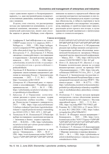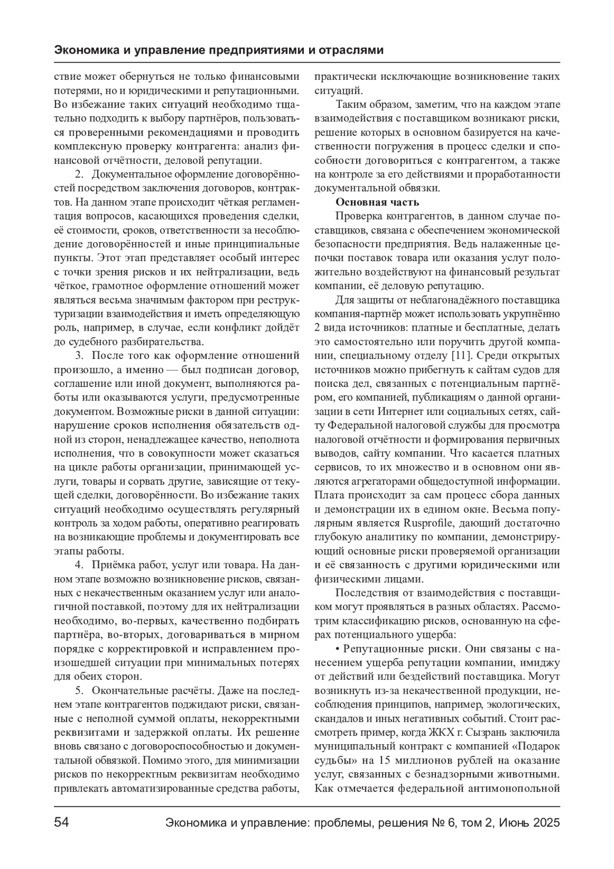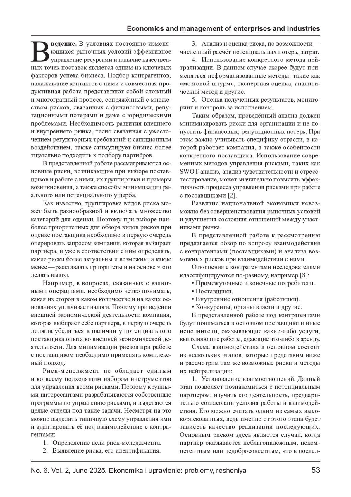 2. Бекмурзаева Р. Х., Джандарова Л. Х. Риски, связанные с взаимодействием с поставщиками и подрядчиками // Деловой вестник предпринимателя. - 2021. - № 3(5). - URL: https://cyberleninka.ru/article/n/riski-svyazannyes-vzaimodeystviem-s-postavschikami-ipodryadchikami. EDN: OEWUQP