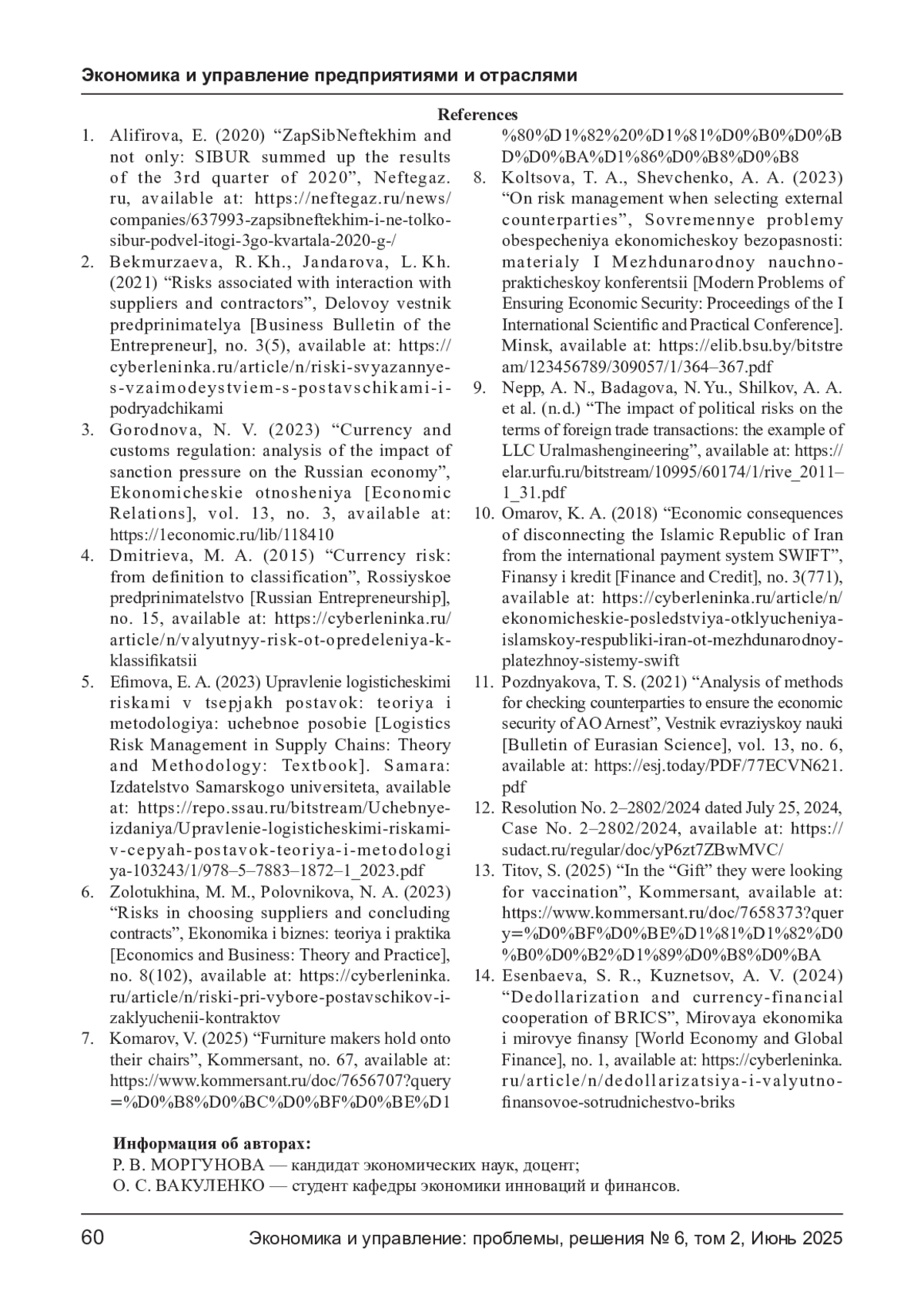 11. Позднякова Т. С. Анализ методов проверки контрагентов с целью обеспечения экономической безопасности АО “Арнест” // Вестник евразийской науки. - 2021. - Т. 13, № 6. - URL: https://esj.today/PDF/77ECVN621.pdf. EDN: WSXOPM