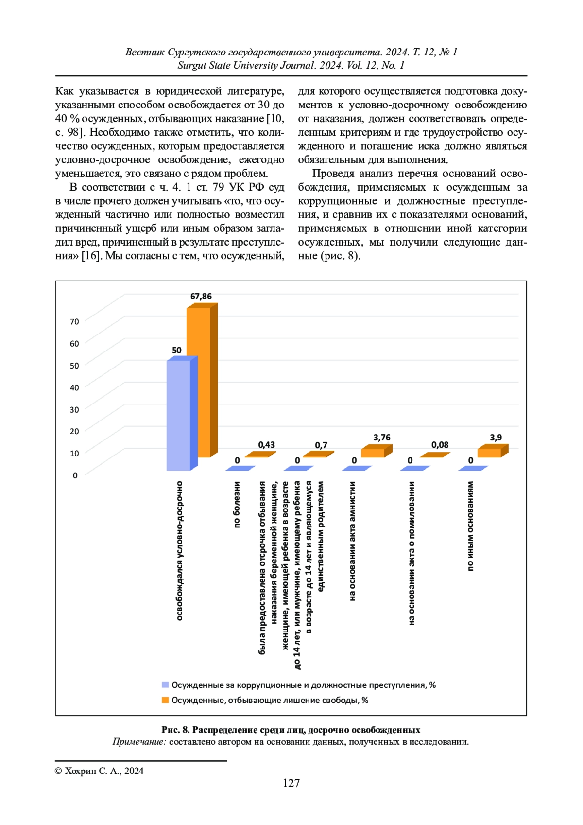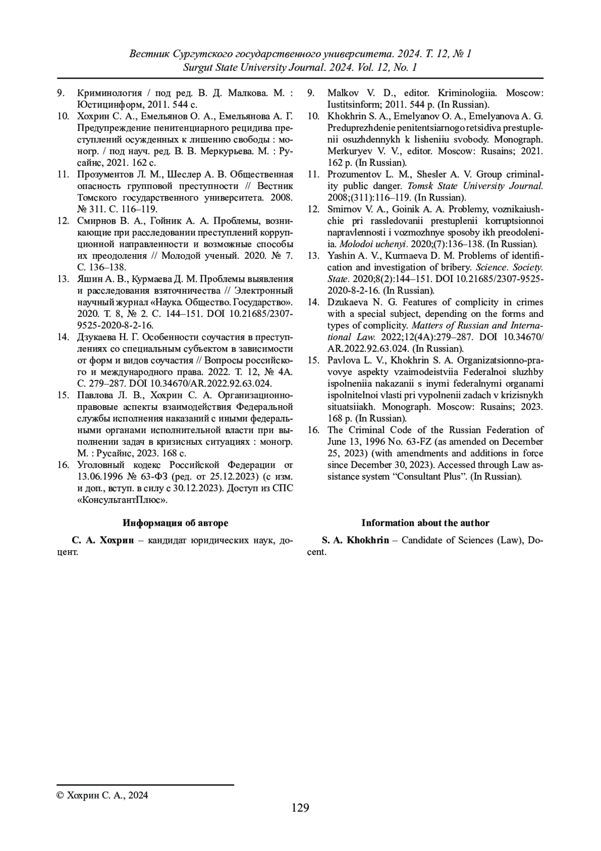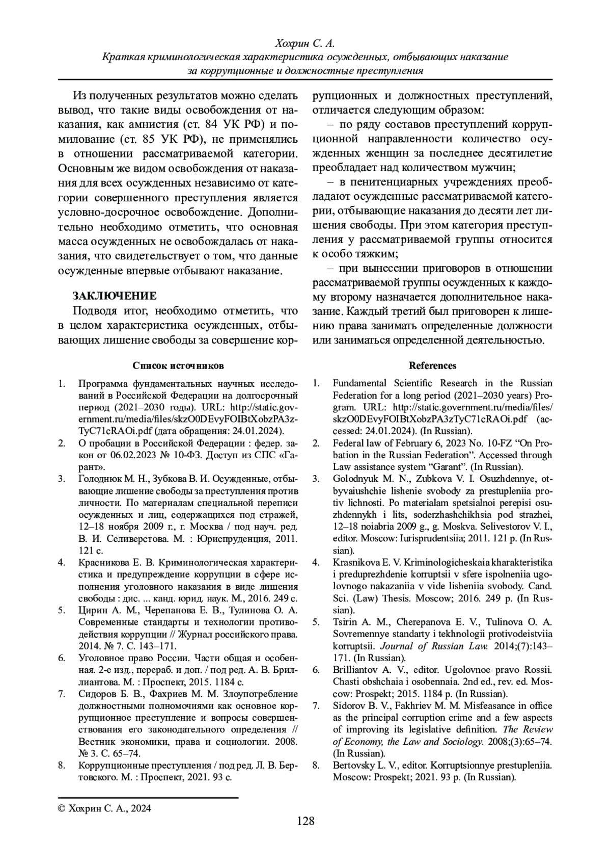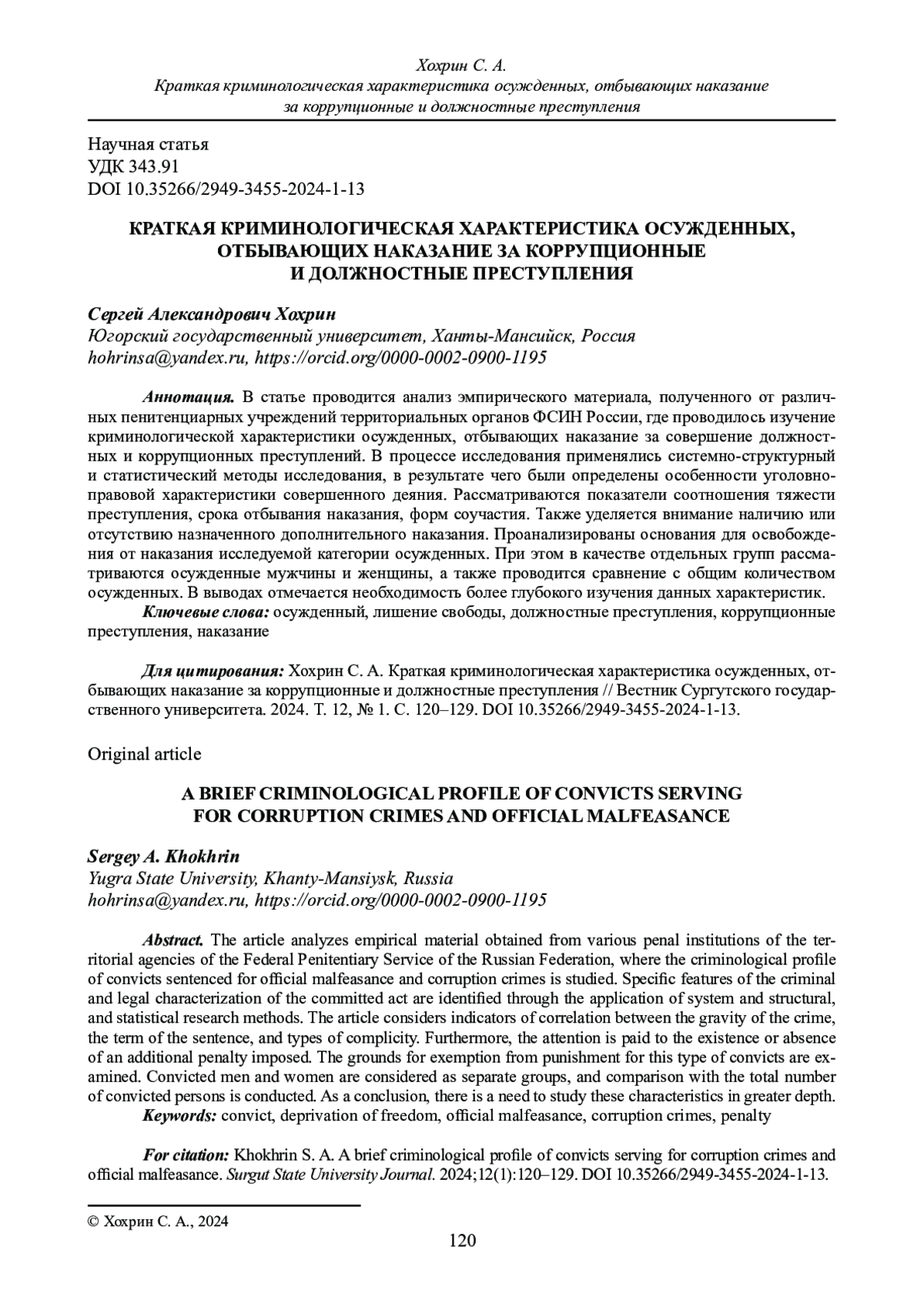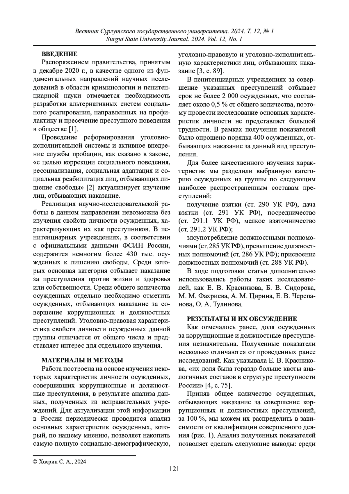ХОХРИН С. А. КРАТКАЯ КРИМИНОЛОГИЧЕСКАЯ ХАРАКТЕРИСТИКА ОСУЖДЕННЫХ, ОТБЫВАЮЩИХ НАКАЗАНИЕ ЗА КОРРУПЦИОННЫЕ И ДОЛЖНОСТНЫЕ ПРЕСТУПЛЕНИЯ // ВЕСТНИК СУРГУТСКОГО ГОСУДАРСТВЕННОГО УНИВЕРСИТЕТА. 2024. ТОМ 12, № 1