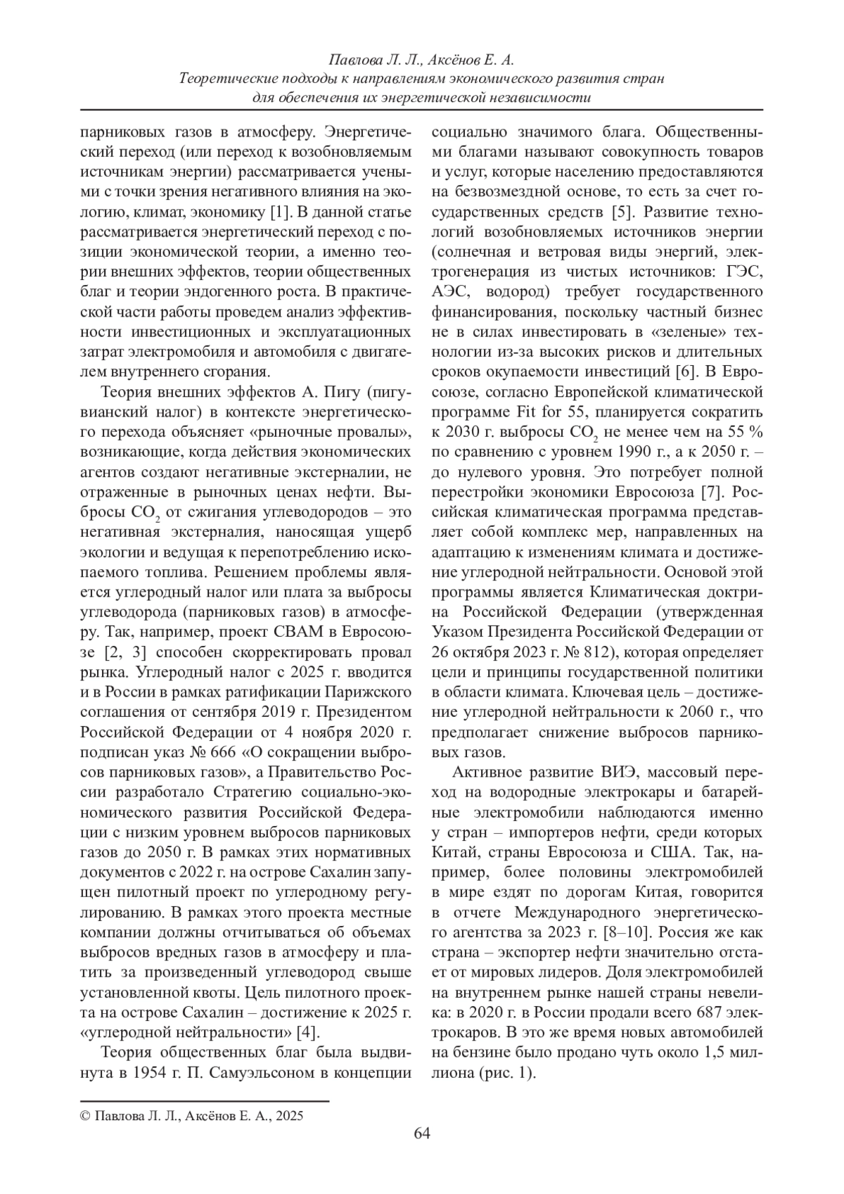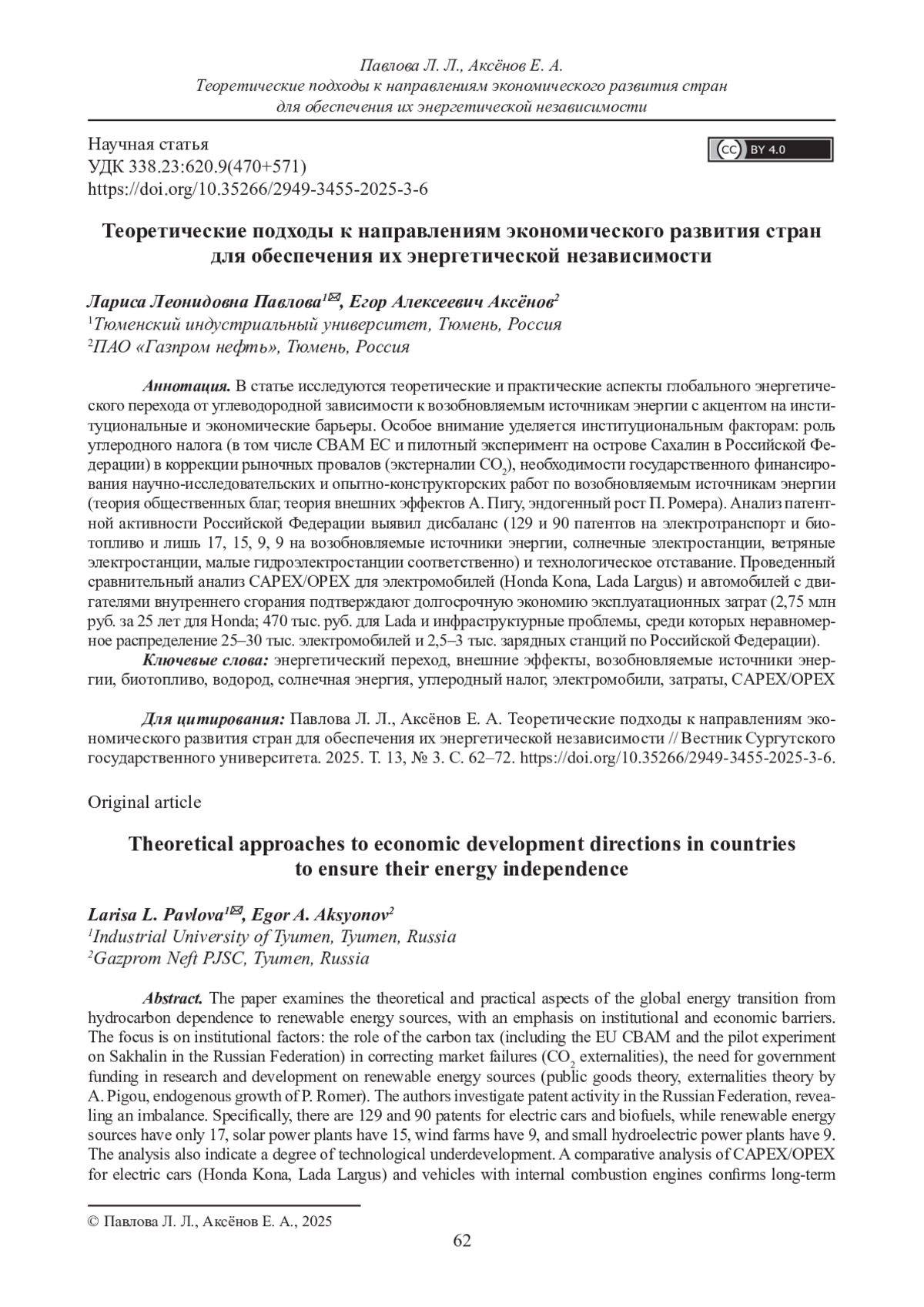 В статье исследуются теоретические и практические аспекты глобального энергетического перехода от углеводородной зависимости к возобновляемым источникам энергии с акцентом на институциональные и экономические барьеры. Особое внимание уделяется институциональным факторам: роль углеродного налога (в том числе CBAM ЕС и пилотный эксперимент на острове Сахалин в Российской Федерации) в коррекции рыночных провалов (экстерналии CO2), необходимости государственного финансирования научно-исследовательских и опытно-конструкторских работ по возобновляемым источникам энергии (теория общественных благ, теория внешних эффектов А. Пигу, эндогенный рост П. Ромера). Анализ патентной активности Российской Федерации выявил дисбаланс (129 и 90 патентов на электротранспорт и биотопливо и лишь 17, 15, 9, 9 на возобновляемые источники энергии, солнечные электростанции, ветряные электростанции, малые гидроэлектростанции соответственно) и технологическое отставание. Проведенный сравнительный анализ CAPEX/OPEX для электромобилей (Honda Kona, Lada Largus) и автомобилей с двигателями внутреннего сгорания подтверждают долгосрочную экономию эксплуатационных затрат (2,75 млн руб. за 25 лет для Honda; 470 тыс. руб. для Lada и инфраструктурные проблемы, среди которых неравномерное распределение 25–30 тыс. электромобилей и 2,5–3 тыс. зарядных станций по Российской Федерации)