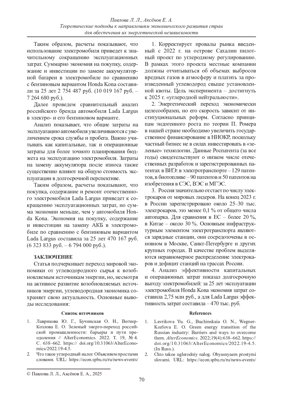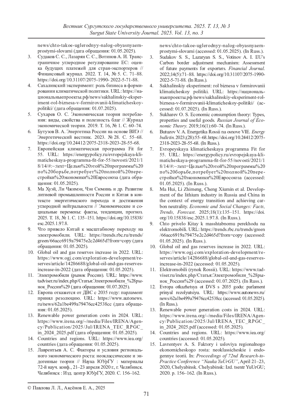 1. Лаврикова Ю. Г., Бучинская О. Н., ВегнерКозлова Е. О. Зеленый энерго-переход российской промышленности: барьеры и пути преодоления // AlterEconomics. 2022. Т. 19, № 4. С. 638-662. https://doitps://doi.org/doi.org/10.31063/AlterEconomics/2022.19-4.5.