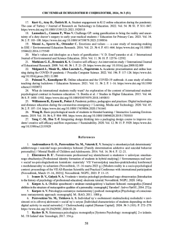 2. Елистратова, Д. Э. Формирование профессиональной идентичности у студентов в условиях смешанного обучения / Д. Э. Елистратова // Современная реальность в социально-психологическом контексте - 2023: Материалы VII Всероссийской научно-практической конференции с международным участием, Новосибирск, 15-16 марта 2023 года. - Новосибирск: Новосибирский государственный педагогический университет, 2023. - С. 13-15. EDN: NEKABK