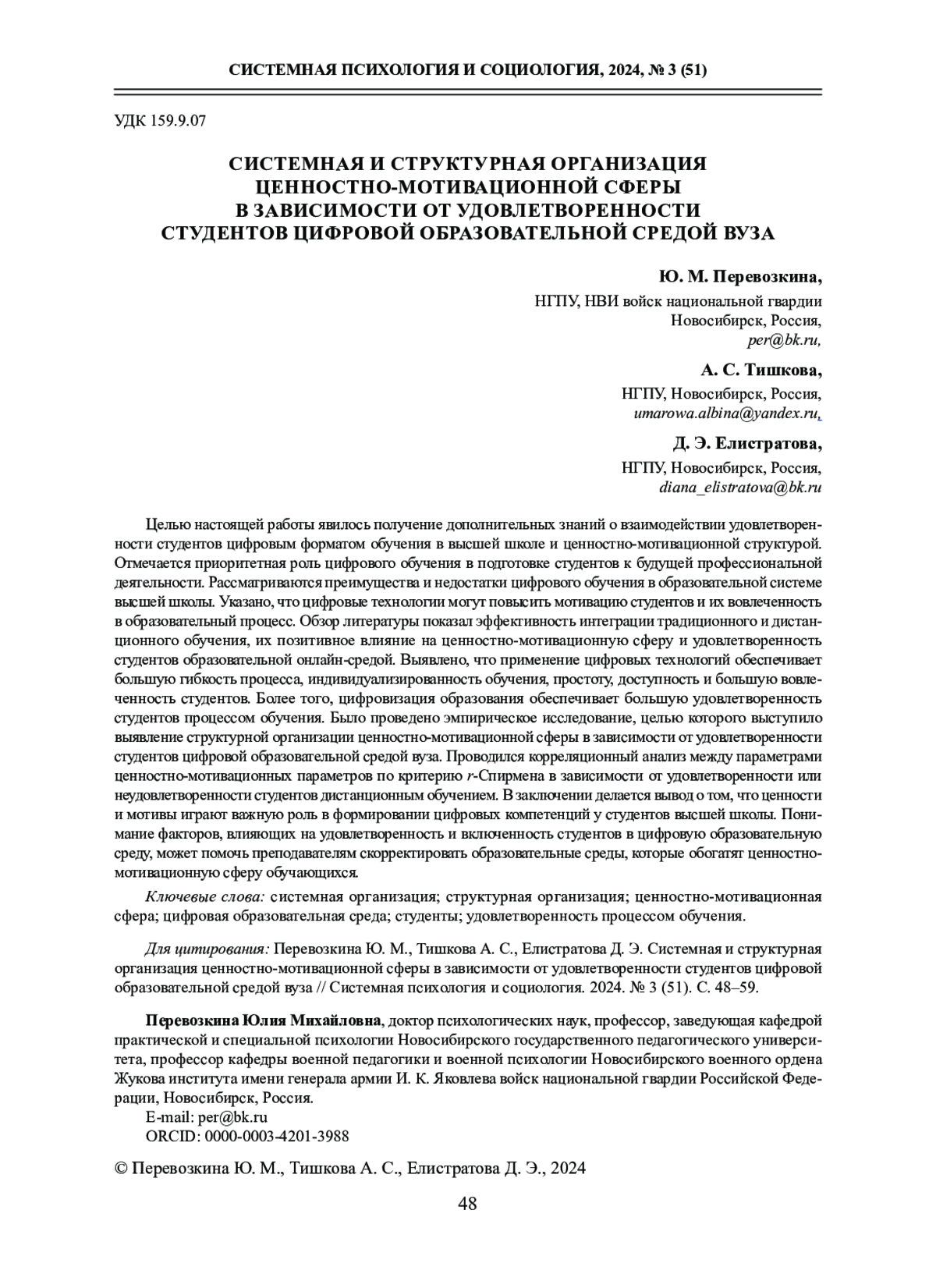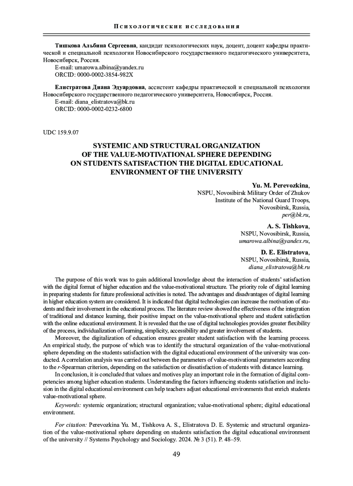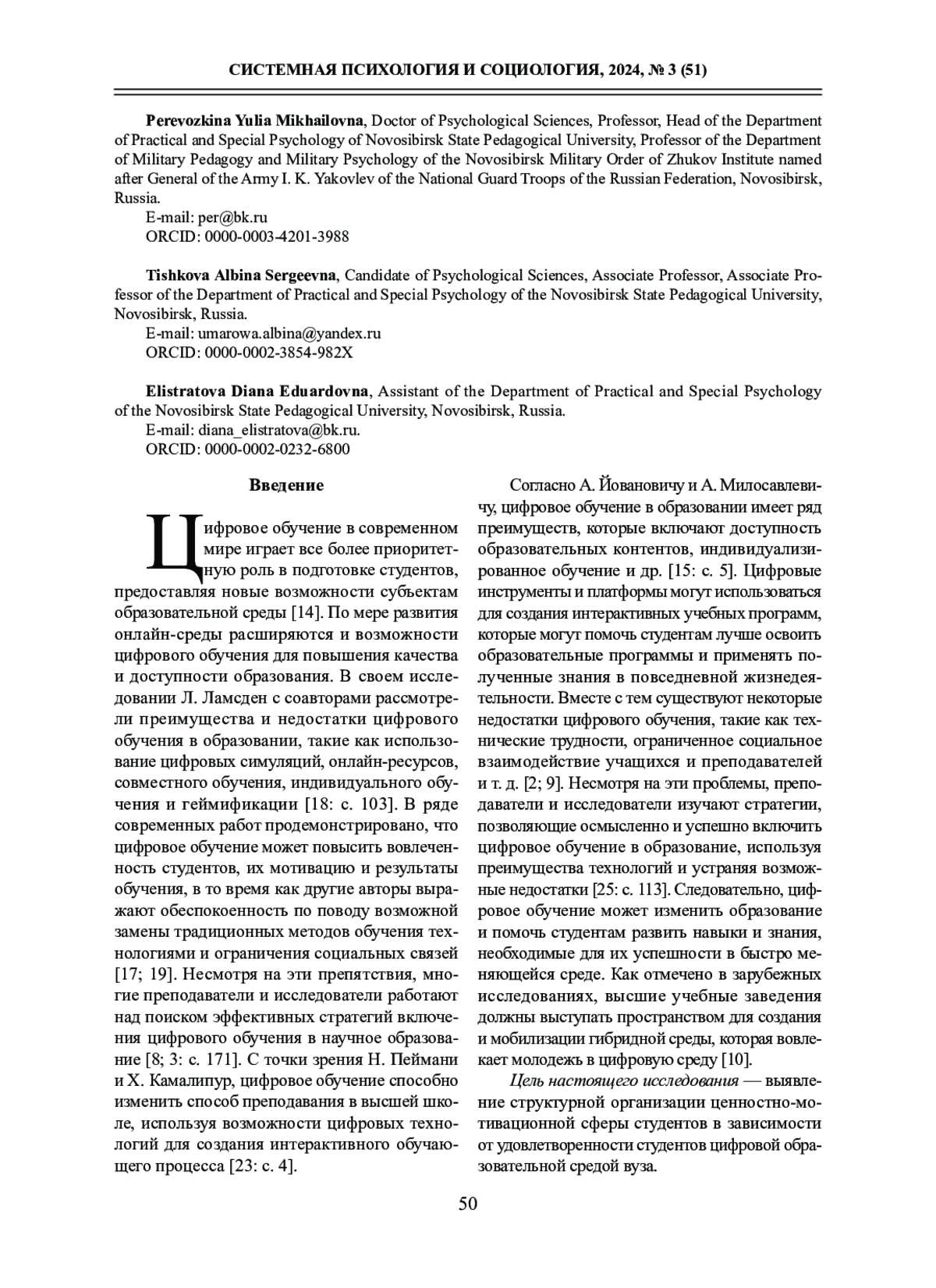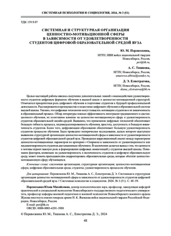 Целью настоящей работы явилось получение дополнительных знаний о взаимодействии удовлетворенности студентов цифровым форматом обучения в высшей школе и ценностно-мотивационной структурой. Отмечается приоритетная роль цифрового обучения в подготовке студентов к будущей профессиональной деятельности. Рассматриваются преимущества и недостатки цифрового обучения в образовательной системе высшей школы. Указано, что цифровые технологии могут повысить мотивацию студентов и их вовлеченность в образовательный процесс. Обзор литературы показал эффективность интеграции традиционного и дистанционного обучения, их позитивное влияние на ценностно-мотивационную сферу и удовлетворенность студентов образовательной онлайн-средой. Выявлено, что применение цифровых технологий обеспечивает большую гибкость процесса, индивидуализированность обучения, простоту, доступность и большую вовлеченность студентов. Более того, цифровизация образования обеспечивает большую удовлетворенность студентов процессом обучения. Было проведено эмпирическое исследование, целью которого выступило выявление структурной организации ценностно-мотивационной сферы в зависимости от удовлетворенности студентов цифровой образовательной средой вуза. Проводился корреляционный анализ между параметрами ценностно-мотивационных параметров по критерию r -Спирмена в зависимости от удовлетворенности или неудовлетворенности студентов дистанционным обучением. В заключении делается вывод о том, что ценности и мотивы играют важную роль в формировании цифровых компетенций у студентов высшей школы. Понимание факторов, влияющих на удовлетворенность и включенность студентов в цифровую образовательную среду, может помочь преподавателям скорректировать образовательные среды, которые обогатят ценностно-мотивационную сферу обучающихся.
