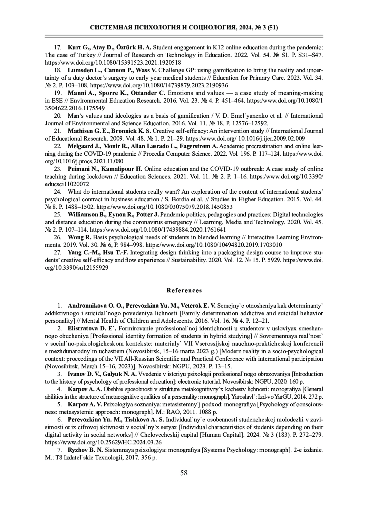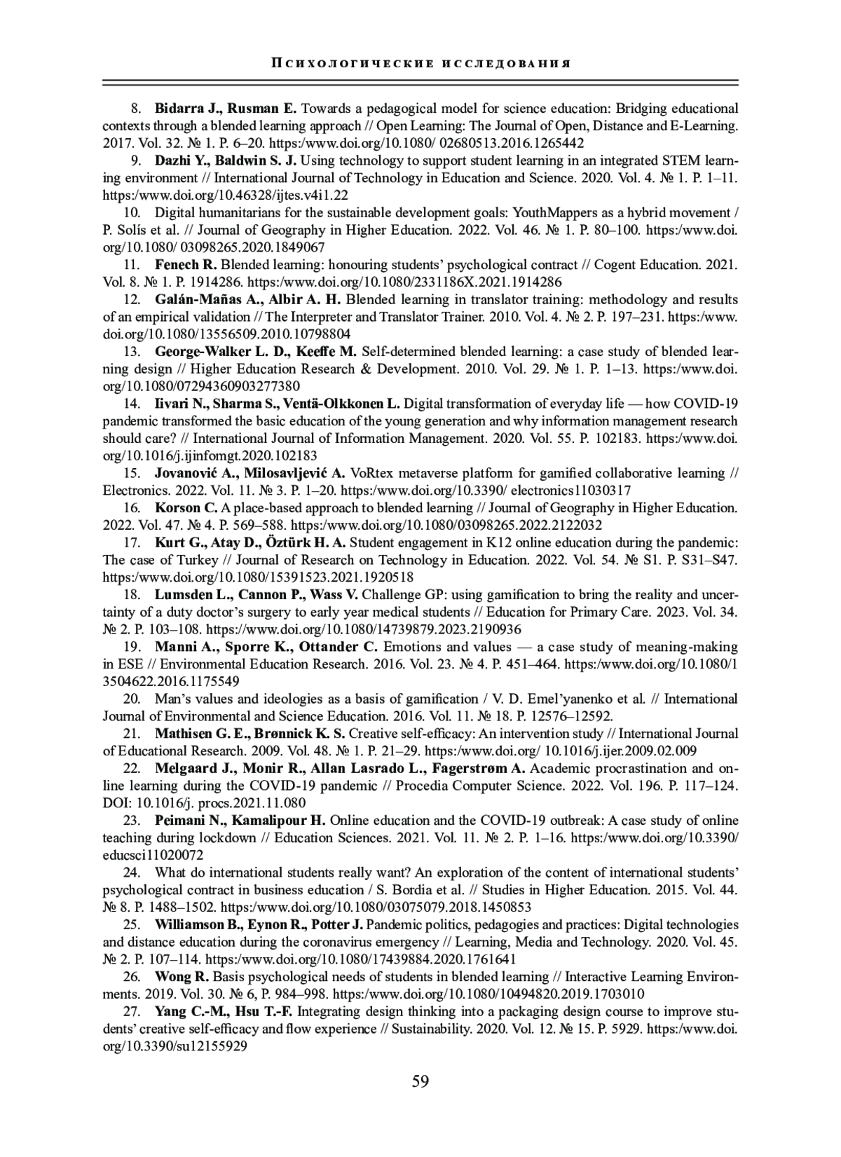 26. Wong R. Basis psychological needs of students in blended learning // Interactive Learning Environments. 2019. Vol. 30. № 6, P. 984-998. https:/www. DOI: 10.1080/10494820.2019.1703010