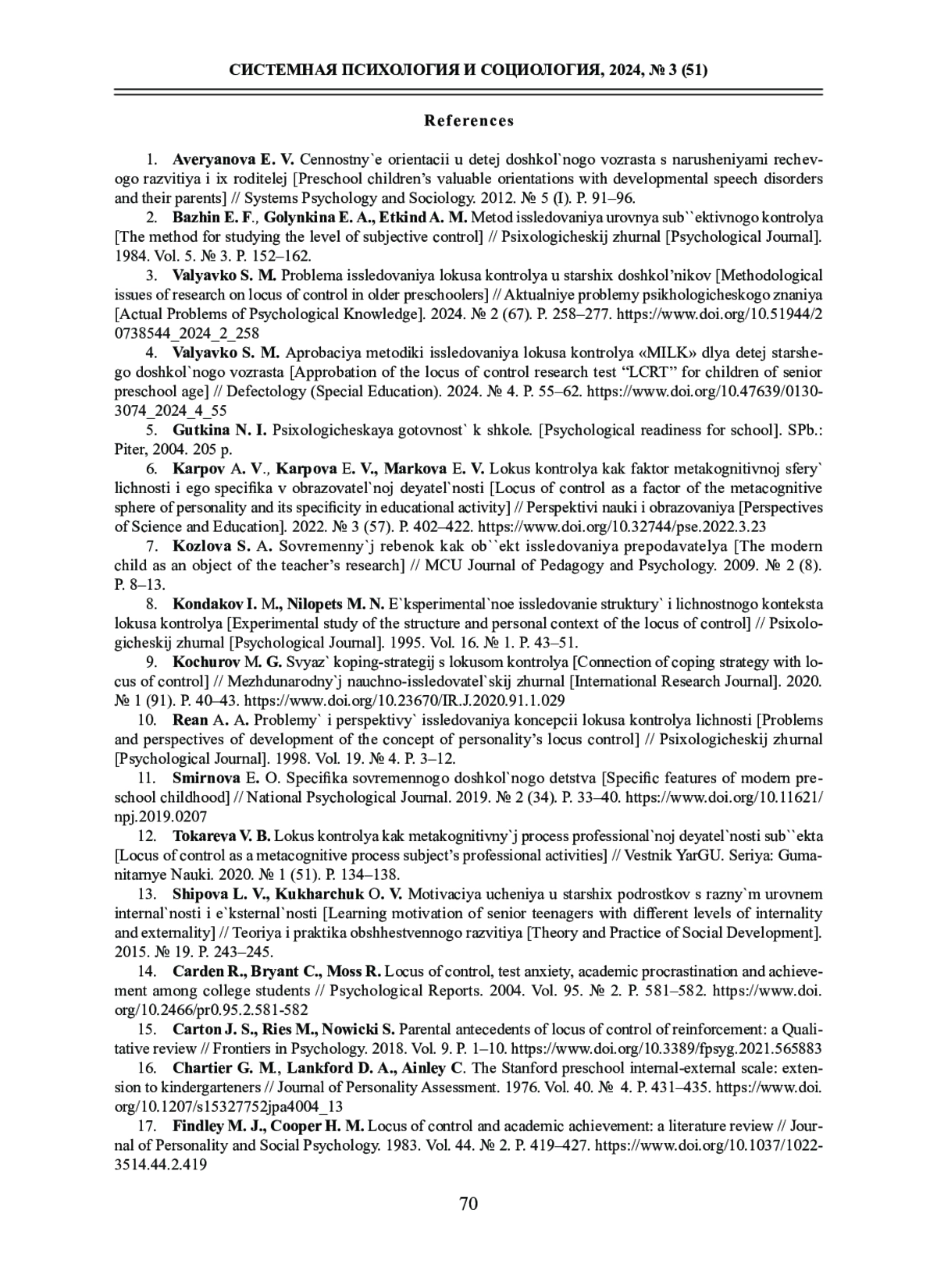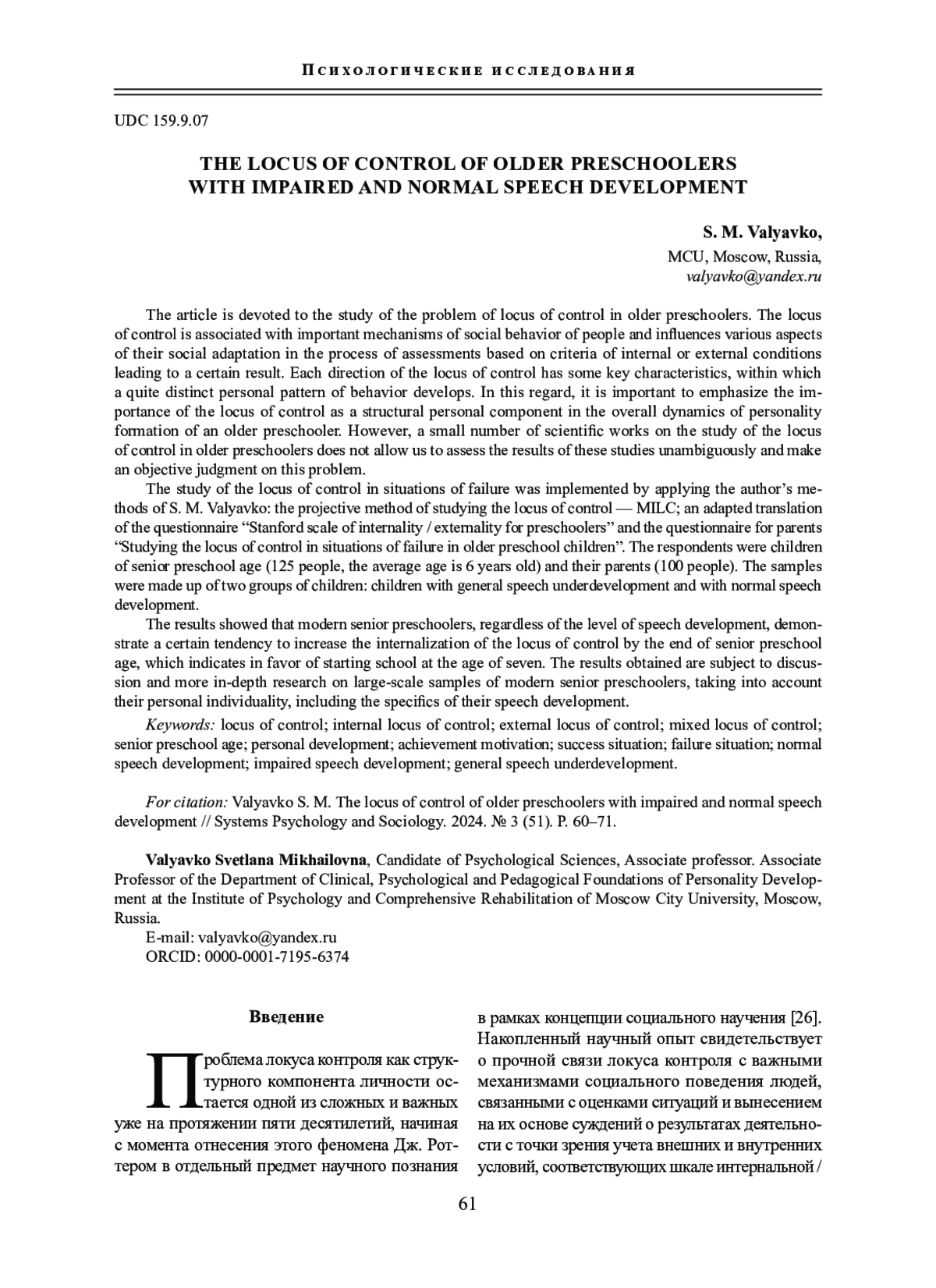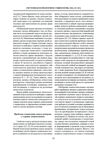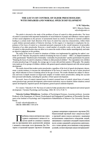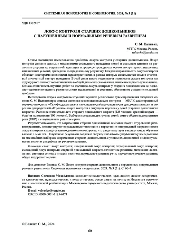 ВАЛЯВКО С. М. ЛОКУС КОНТРОЛЯ СТАРШИХ ДОШКОЛЬНИКОВ С НАРУШЕННЫМ И НОРМАЛЬНЫМ РЕЧЕВЫМ РАЗВИТИЕМ // СИСТЕМНАЯ ПСИХОЛОГИЯ И СОЦИОЛОГИЯ. 2024. № 3 (51)