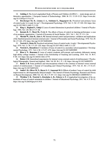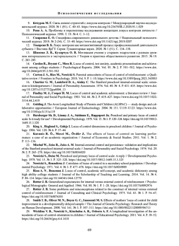 Статья посвящена исследованию проблемы локуса контроля у старших дошкольников. Локус контроля связан с важными механизмами социального поведения людей и оказывает влияние на различные стороны их социальной адаптации в процессе проводимых оценок по критериям внутренних или внешних условий, приведших к определенному результату. Каждая направленность локуса контроля обладает некоторыми ключевыми характеристиками, в рамках которых складывается вполне отчетливый личностный паттерн поведения. В этой связи важно подчеркнуть значимость локуса контроля как структурного личностного компонента в общей динамике становления личности старшего дошкольника. Однако единичность научных работ по изучению локуса контроля у старших дошкольников не позволяет однозначно оценить результаты этих исследований и составить объективное суждение по данной проблеме.