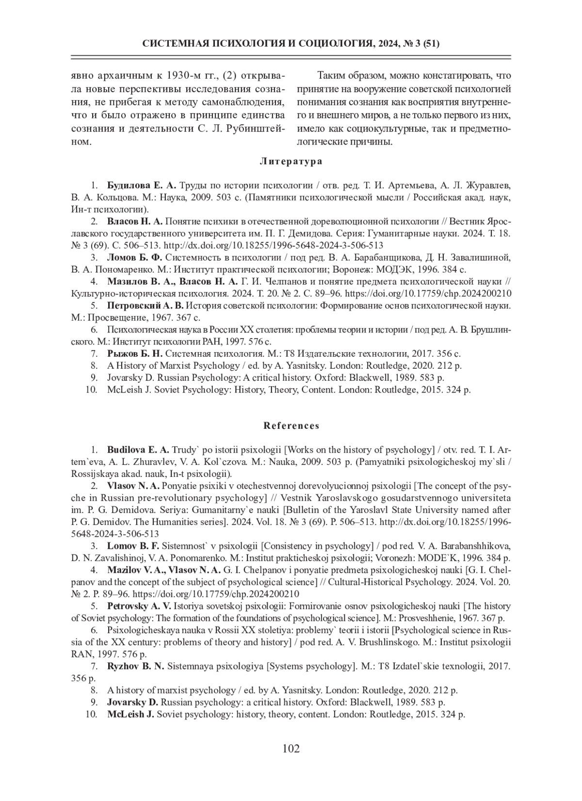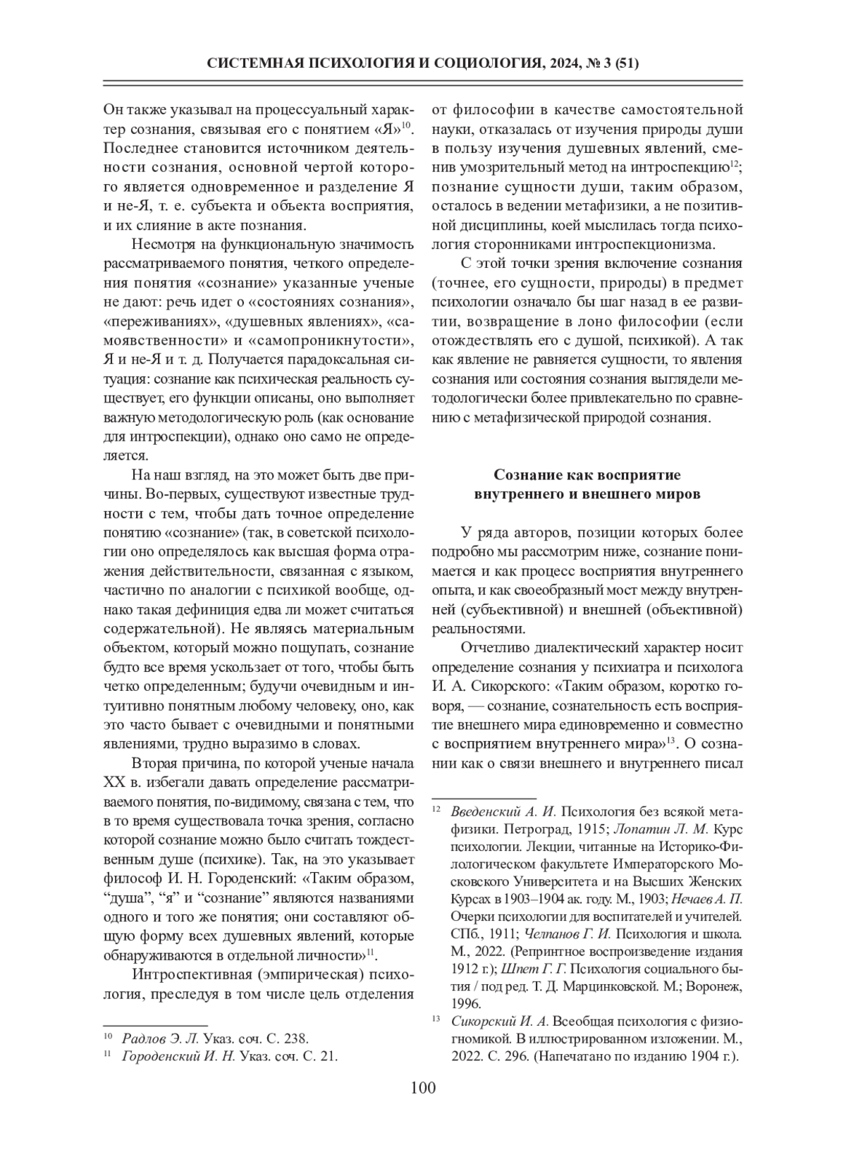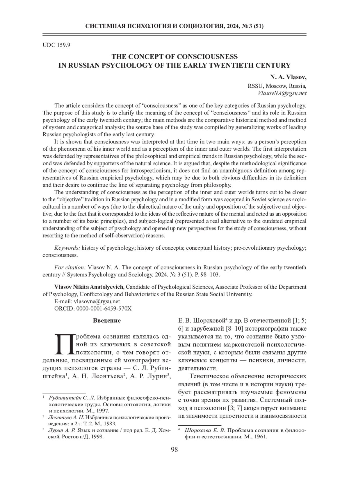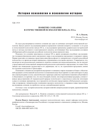 ВЛАСОВ Н. А. ПОНЯТИЕ СОЗНАНИЯ В ОТЕЧЕСТВЕННОЙ ПСИХОЛОГИИ НАЧАЛА ХХ В // СИСТЕМНАЯ ПСИХОЛОГИЯ И СОЦИОЛОГИЯ. 2024. № 3 (51)