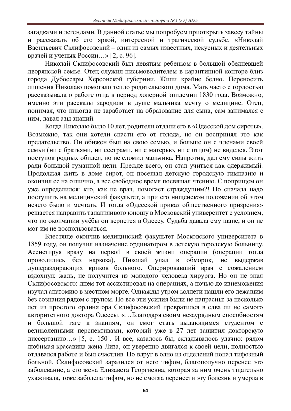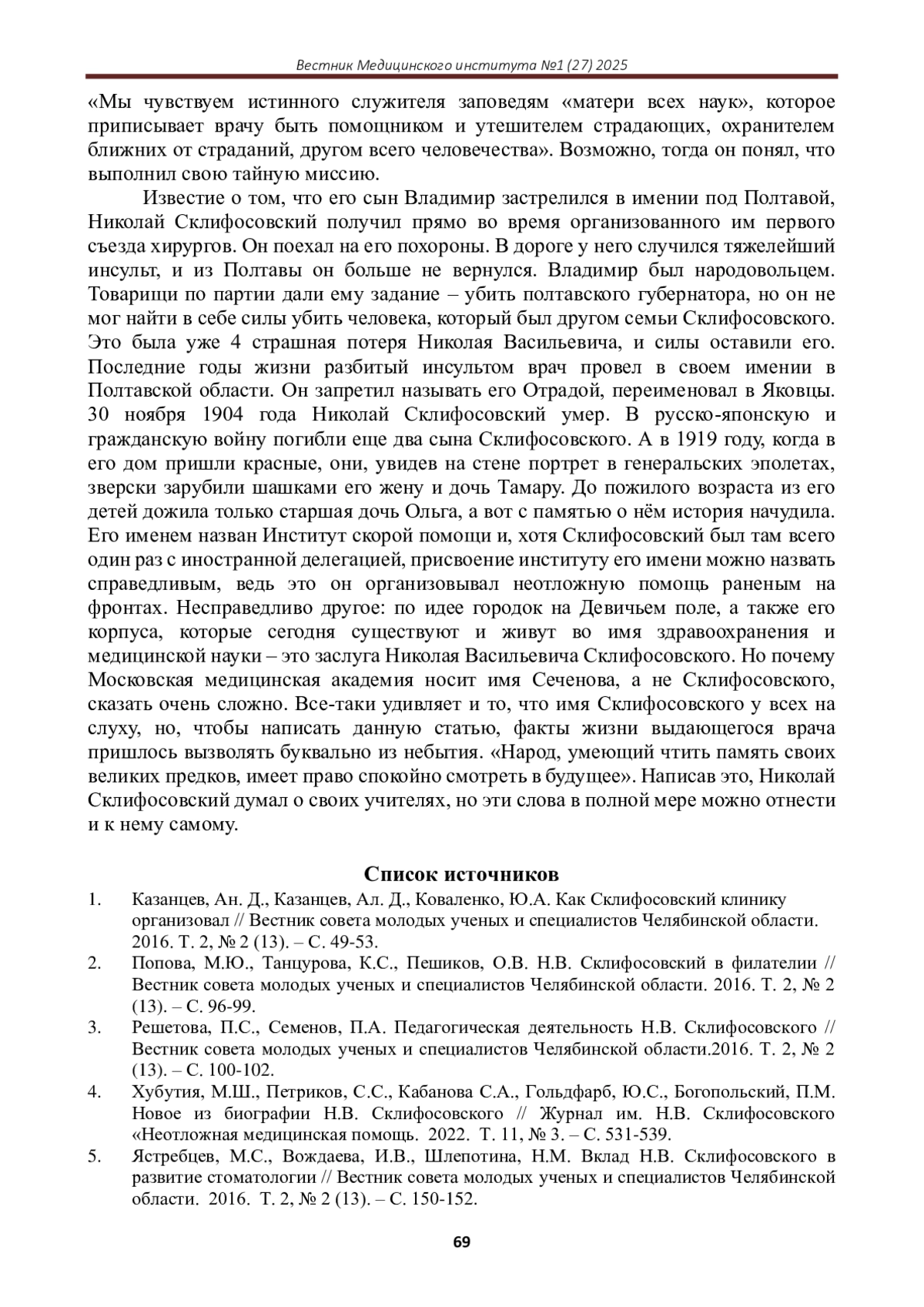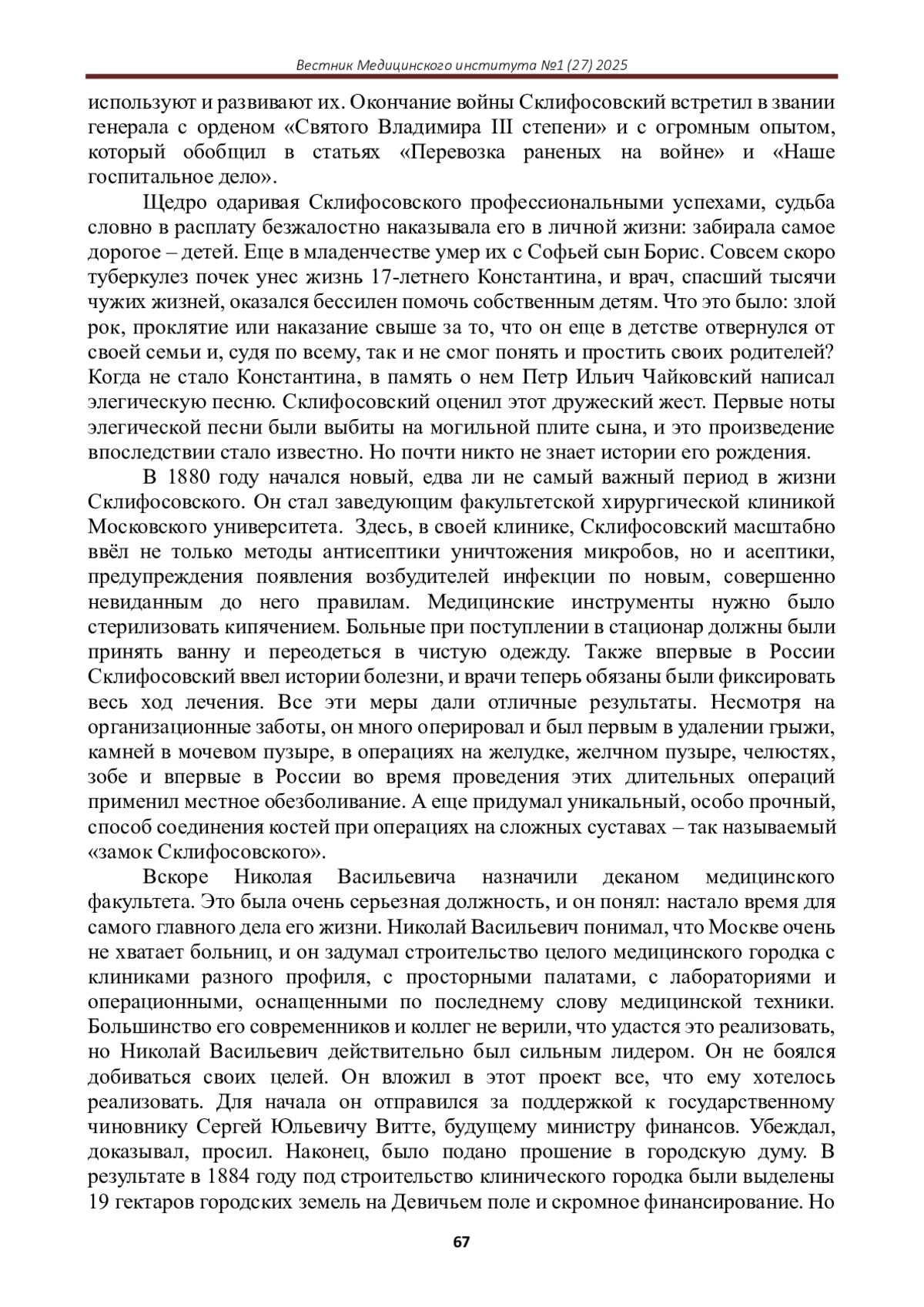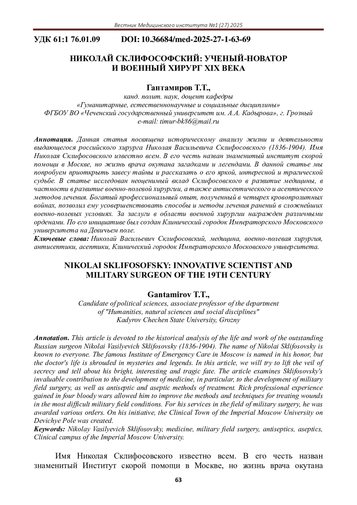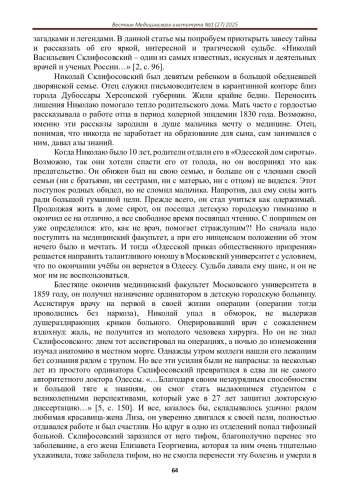 ГАНТАМИРОВ Т.Т. НИКОЛАЙ СКЛИФОСОФСКИЙ: УЧЕНЫЙ-НОВАТОР И ВОЕННЫЙ ХИРУРГ XIX ВЕКА // ВЕСТНИК МЕДИЦИНСКОГО ИНСТИТУТА. 2025. № 1 (27)