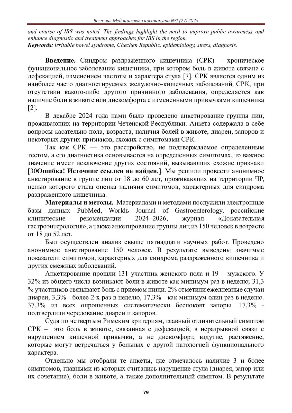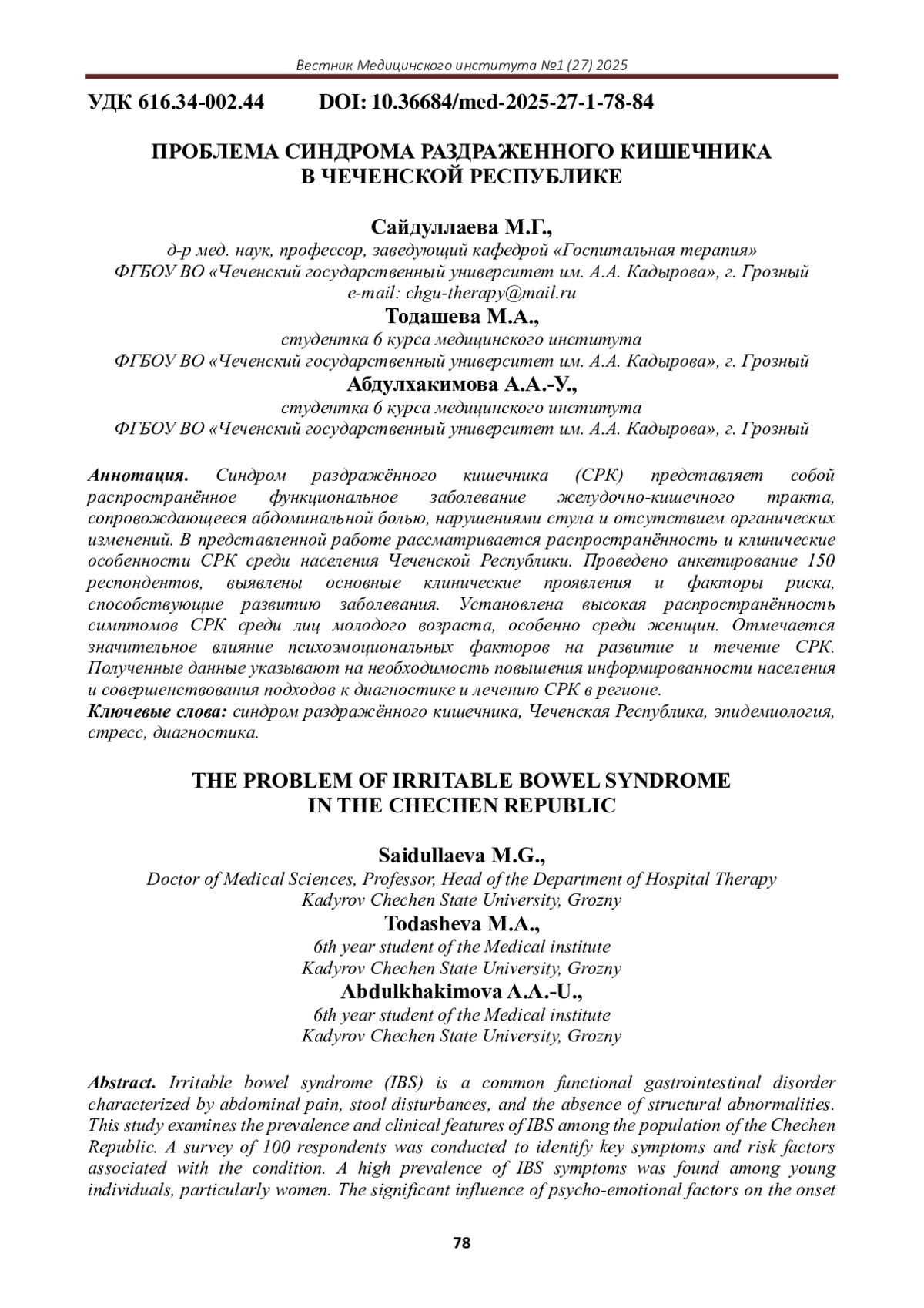 Синдром раздражённого кишечника (СРК) представляет собой распространённое функциональное заболевание желудочно-кишечного тракта, сопровождающееся абдоминальной болью, нарушениями стула и отсутствием органических изменений. В представленной работе рассматривается распространённость и клинические особенности СРК среди населения Чеченской Республики. Проведено анкетирование 150 респондентов, выявлены основные клинические проявления и факторы риска, способствующие развитию заболевания. Установлена высокая распространённость симптомов СРК среди лиц молодого возраста, особенно среди женщин. Отмечается значительное влияние психоэмоциональных факторов на развитие и течение СРК. Полученные данные указывают на необходимость повышения информированности населения и совершенствования подходов к диагностике и лечению СРК в регионе.