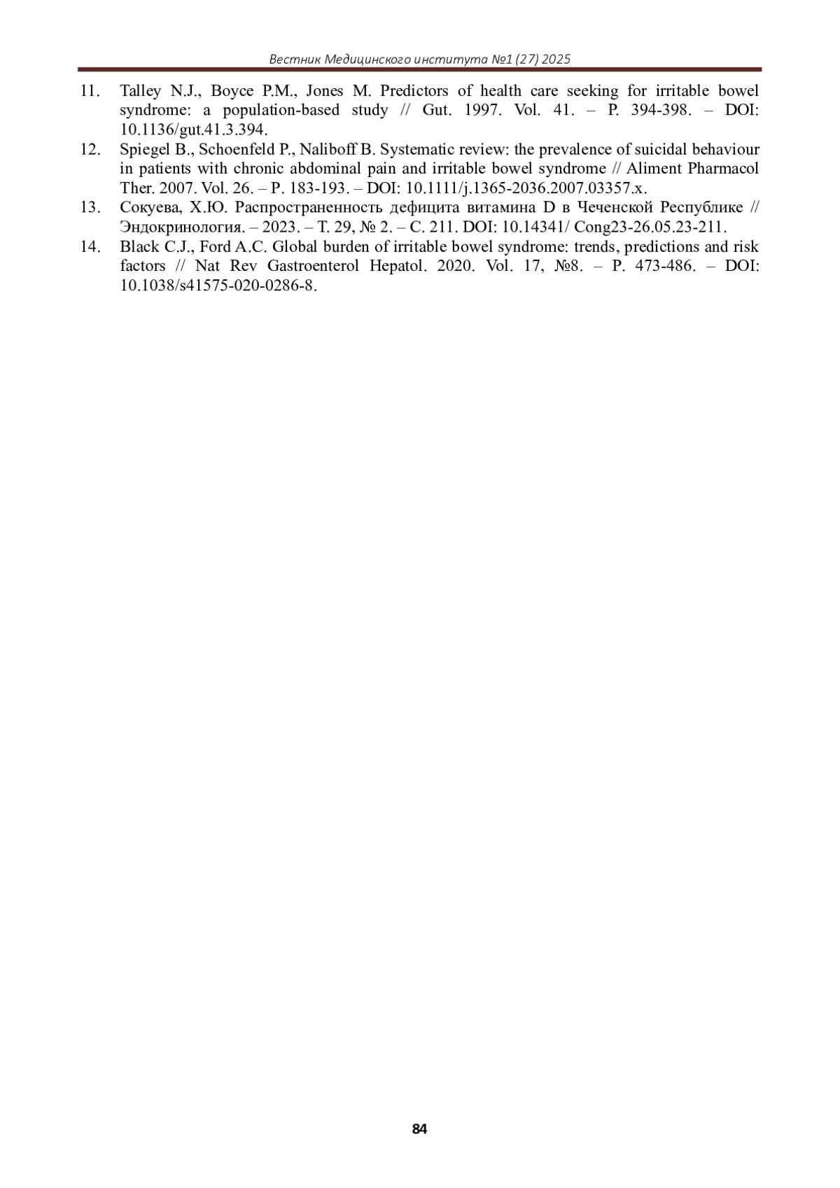 2. Гаус, О.В., Ливзан, М.А. Влияние социодемографических факторов, пищевых привычек и психологического статуса на развитие синдрома раздраженного кишечника // Профилактическая медицина. 2022. Т. 25, №11. - С. 84-91. -. DOI: 10.17116/profmed20222511184 EDN: LZSNGW