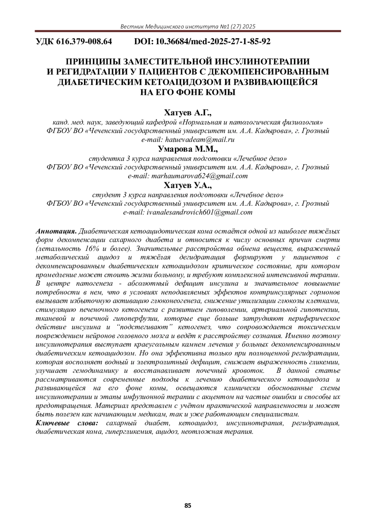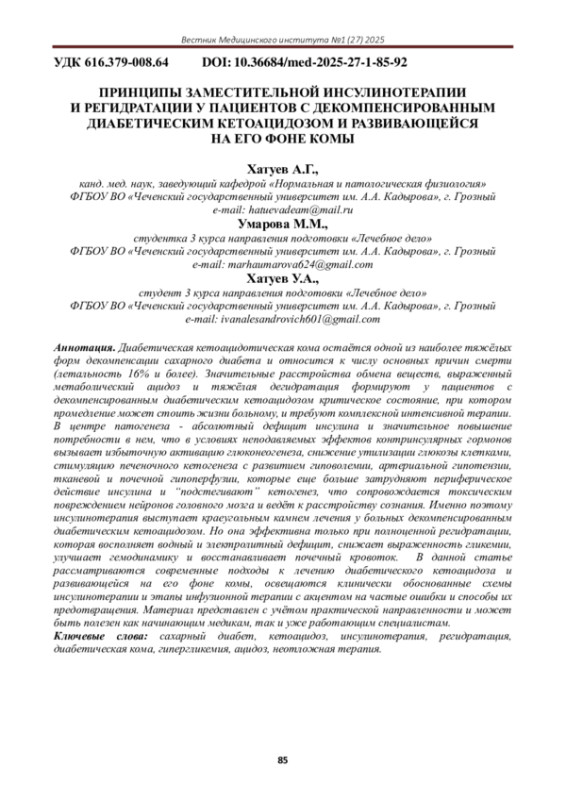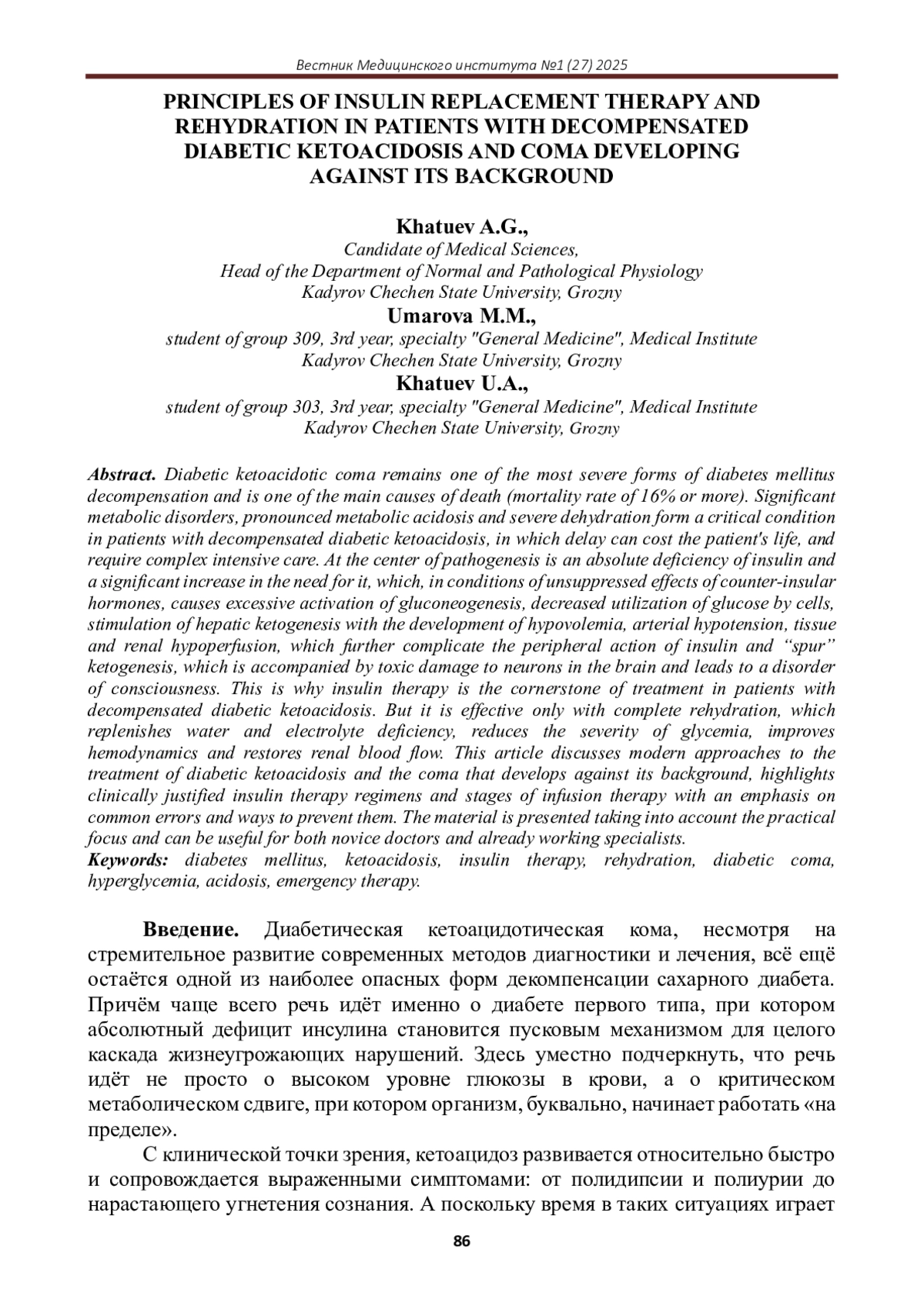 ХАТУЕВ А.Г., ХАТУЕВ У., УМАРОВА М.М. ПРИНЦИПЫ ЗАМЕСТИТЕЛЬНОЙ ИНСУЛИНОТЕРАПИИ И РЕГИДРАТАЦИИ У ПАЦИЕНТОВ С ДЕКОМПЕНСИРОВАННЫМ ДИАБЕТИЧЕСКИМ КЕТОАЦИДОЗОМ И РАЗВИВАЮЩЕЙСЯ НА ЕГО ФОНЕ КОМЫ // ВЕСТНИК МЕДИЦИНСКОГО ИНСТИТУТА. 2025. № 1 (27)