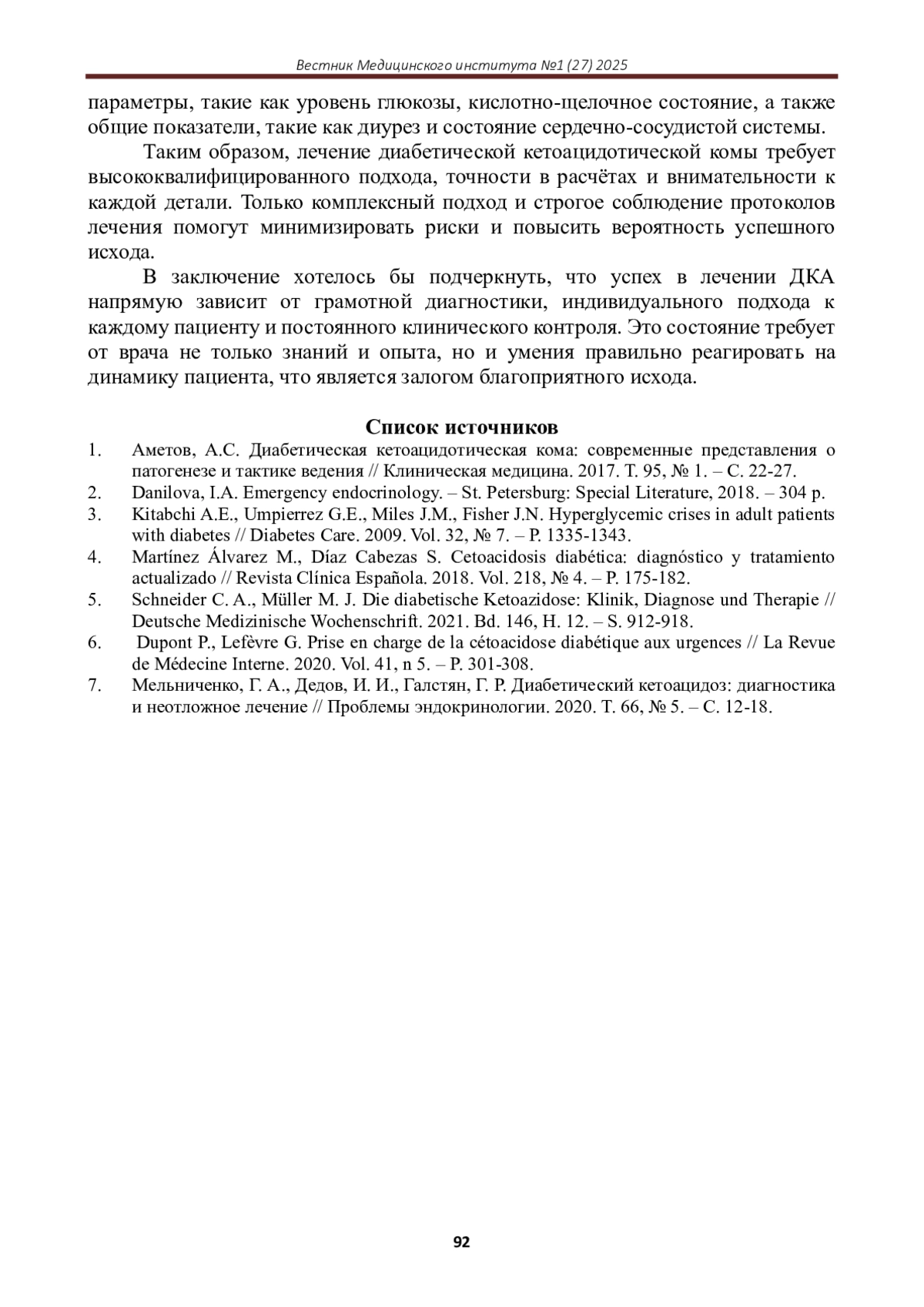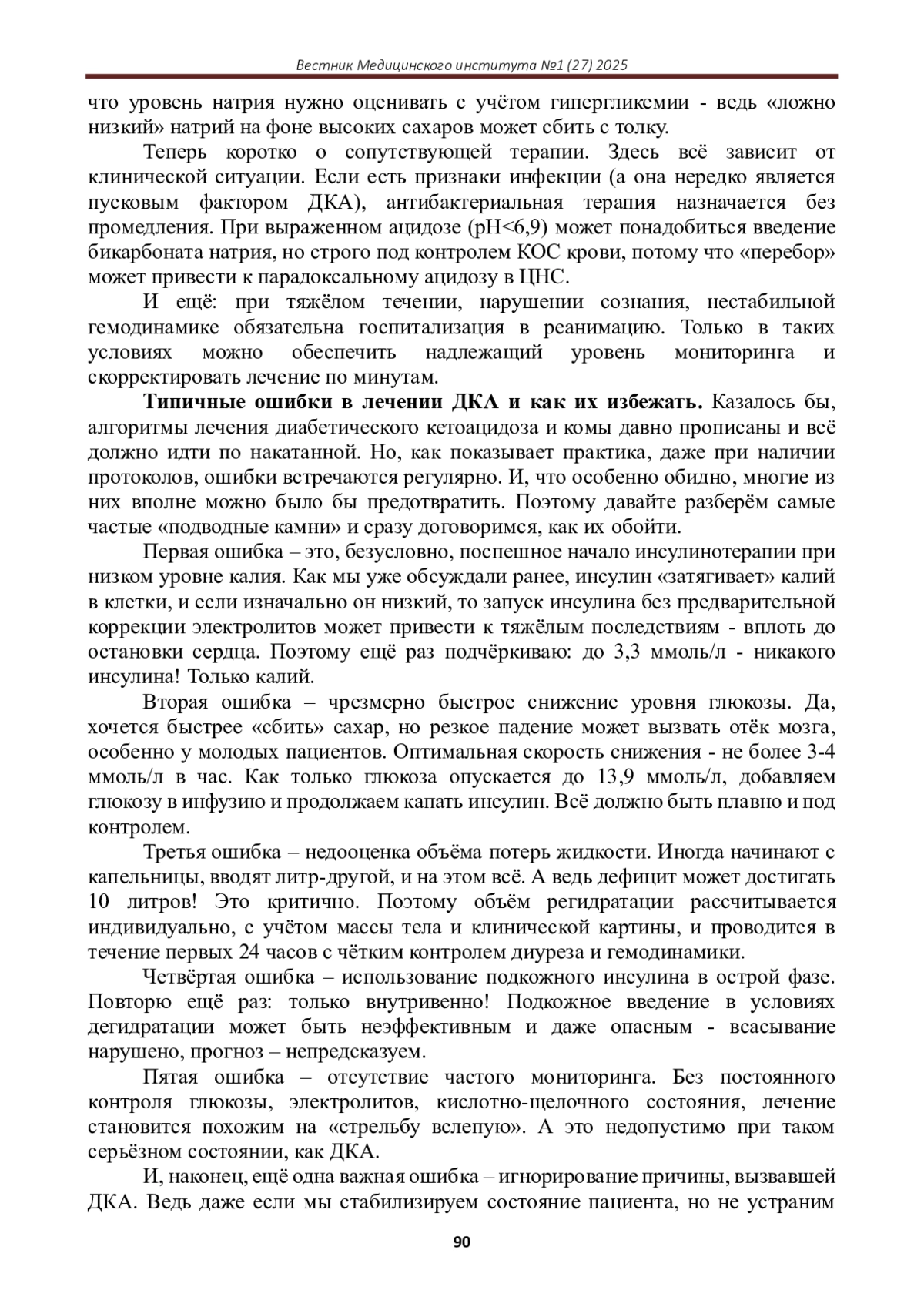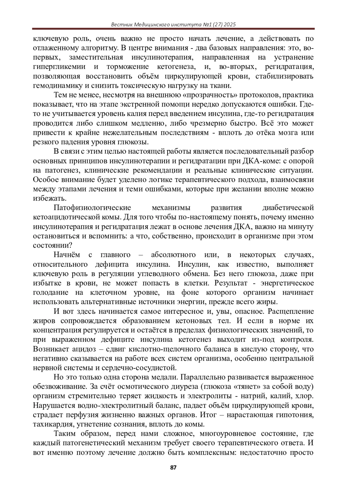 Статья: ПРИНЦИПЫ ЗАМЕСТИТЕЛЬНОЙ ИНСУЛИНОТЕРАПИИ И РЕГИДРАТАЦИИ У ПАЦИЕНТОВ С ДЕКОМПЕНСИРОВАННЫМ ДИАБЕТИЧЕСКИМ КЕТОАЦИДОЗОМ И РАЗВИВАЮЩЕЙСЯ НА ЕГО ФОНЕ КОМЫ (2025)