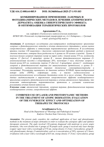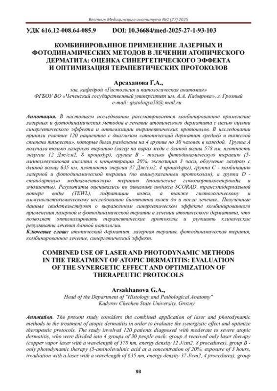 В настоящем исследовании рассматривается комбинированное применение лазерных и фотодинамических методов в лечении атопического дерматита с целью оценки синергетического эффекта и оптимизации терапевтических протоколов. В исследовании приняли участие 120 пациентов с диагнозом «атопический дерматит средней и тяжелой степени тяжести», которые были разделены на 4 группы по 30 человек в каждой. Группа А получала только лазерную терапию (лазер на парах меди с длиной волны 578 нм, плотность энергии 12 Дж/см2, 8 процедур), группа B - только фотодинамическую терапию (5-аминолевулиновая кислота в концентрации 20%, экспозиция 3 часа, облучение лазером с длиной волны 635 нм, плотность энергии 37 Дж/см2, 4 процедуры), группа C - комбинацию лазерной и фотодинамической терапии (по вышеуказанным протоколам), а группа D - стандартную медикаментозную терапию (топические глюкокортикостероиды и эмолиенты). Результаты оценивались по динамике индекса SCORAD, трансэпидермальной потере воды (TEWL), гидратации кожи, а также гистологическому и иммуногистохимическому исследованию биоптатов кожи до и после лечения.. Полученные данные свидетельствуют о выраженном синергетическом эффекте комбинированного применения лазерной и фотодинамической терапии в лечении атопического дерматита, что позволяет оптимизировать терапевтические протоколы и улучшить клинические результаты лечения данной патологии.