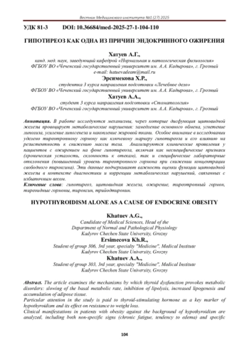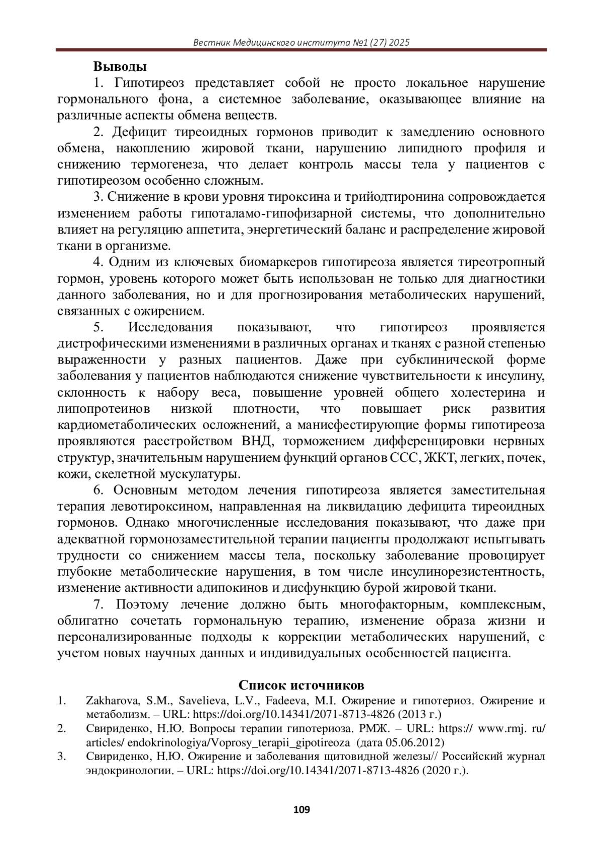 1. Zakharova, S.M., Savelieva, L.V., Fadeeva, M.I. Ожирение и гипотериоз. Ожирение и метаболизм. - URL: 10.14341/2071-8713-4826 (2013 г.). DOI: 10.14341/2071-8713-4826(2013